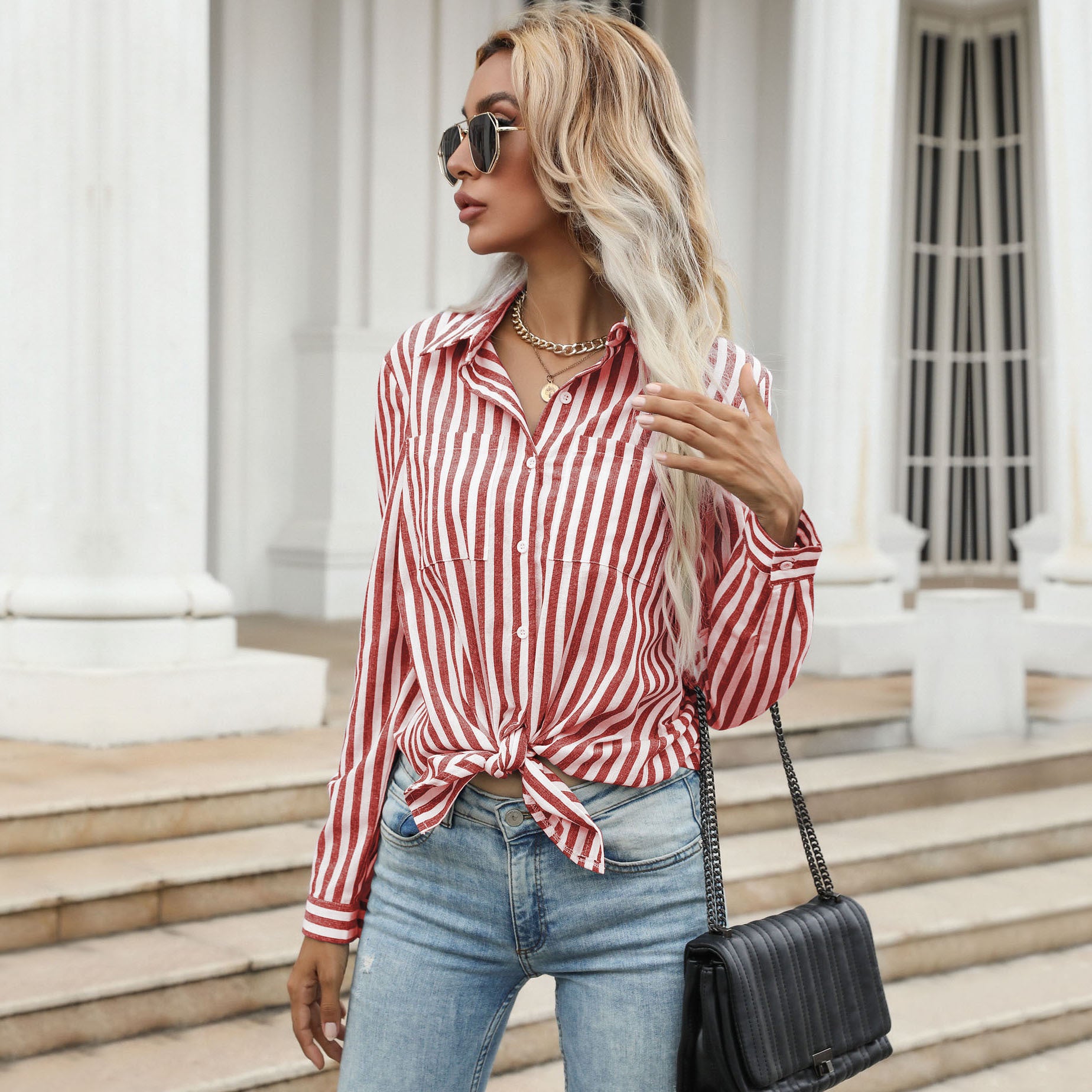 Autumn New Button Cardigan Striped Shirt Lapel Shirt Long Sleeve Commuter Shirt Woman