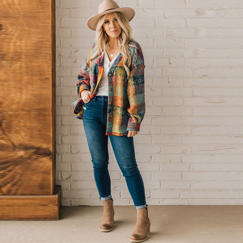 Autumn New Fleece Warm Coat Female Western Multi-Color Plaid Loose Jacket Female