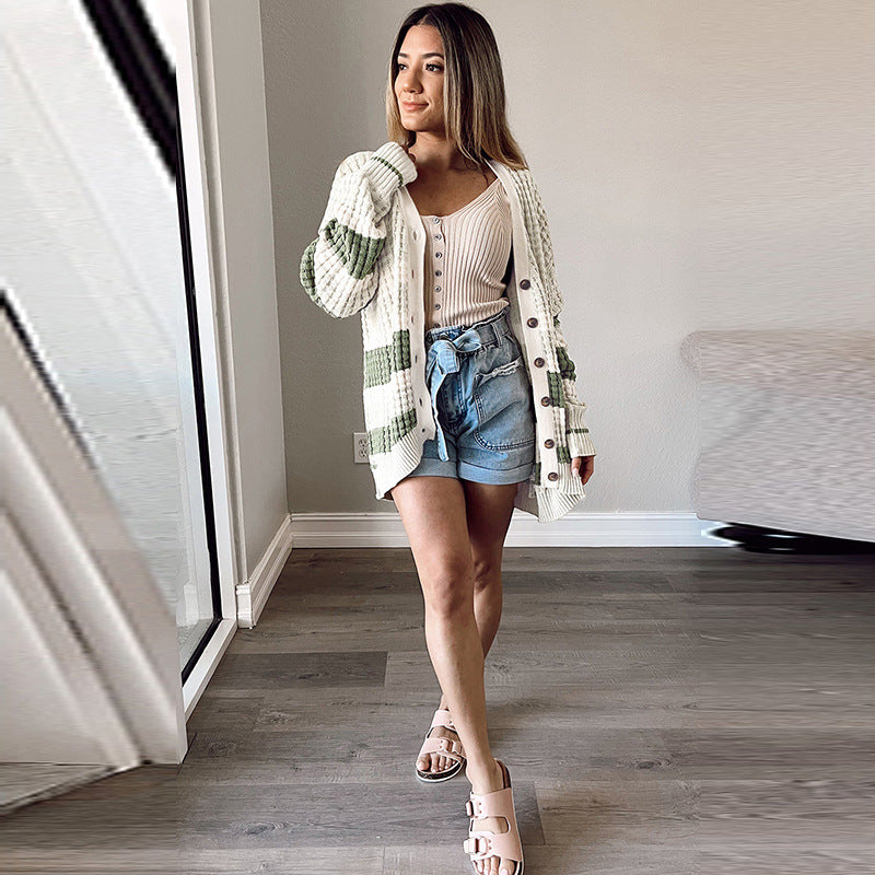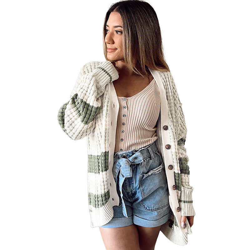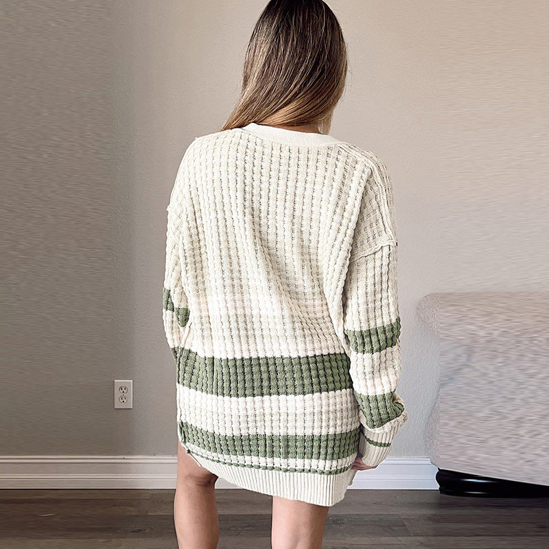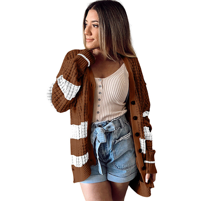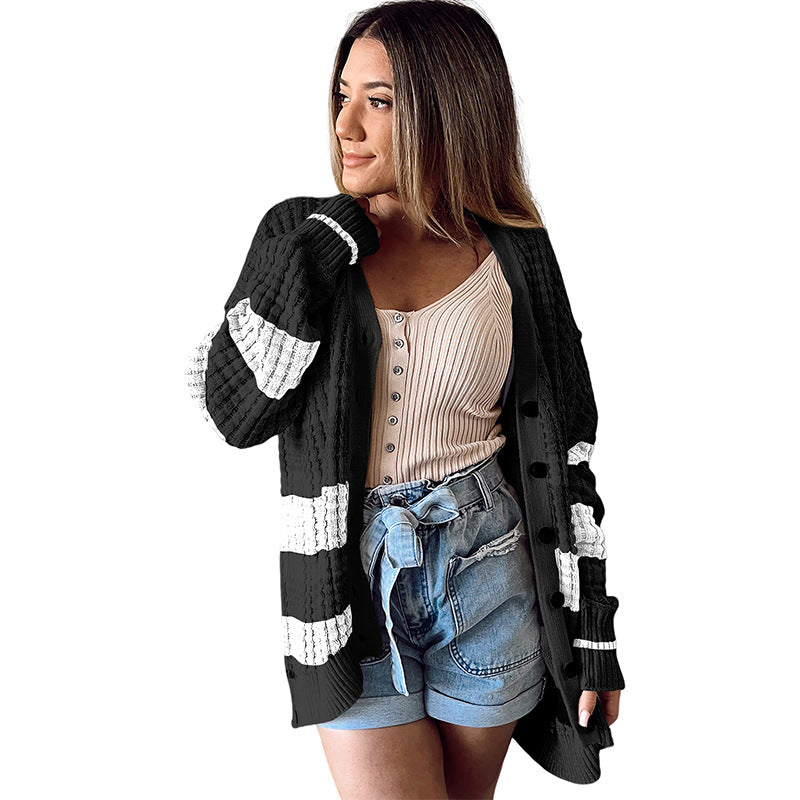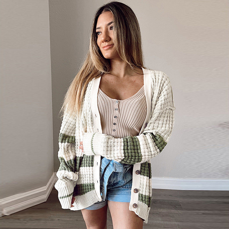 Autumn New Screw Knit Women Personality Color Contrast Loose Buttons Warm Long Sleeve Cardigan Women