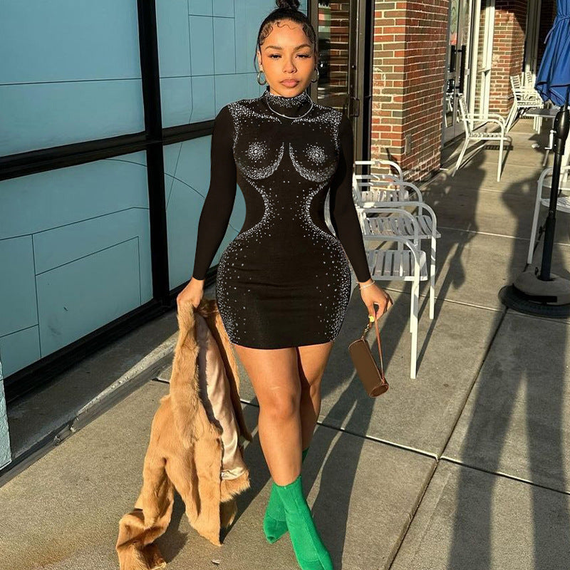 Autumn New Women's Dress Retro Hot Drill Repair Tight Long Sleeve Bag Buttock Dress High Fanny Pack Buttock Bottom Skirt