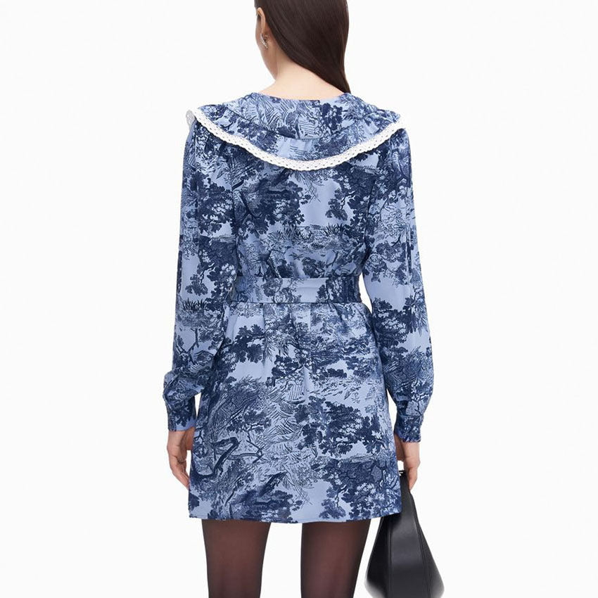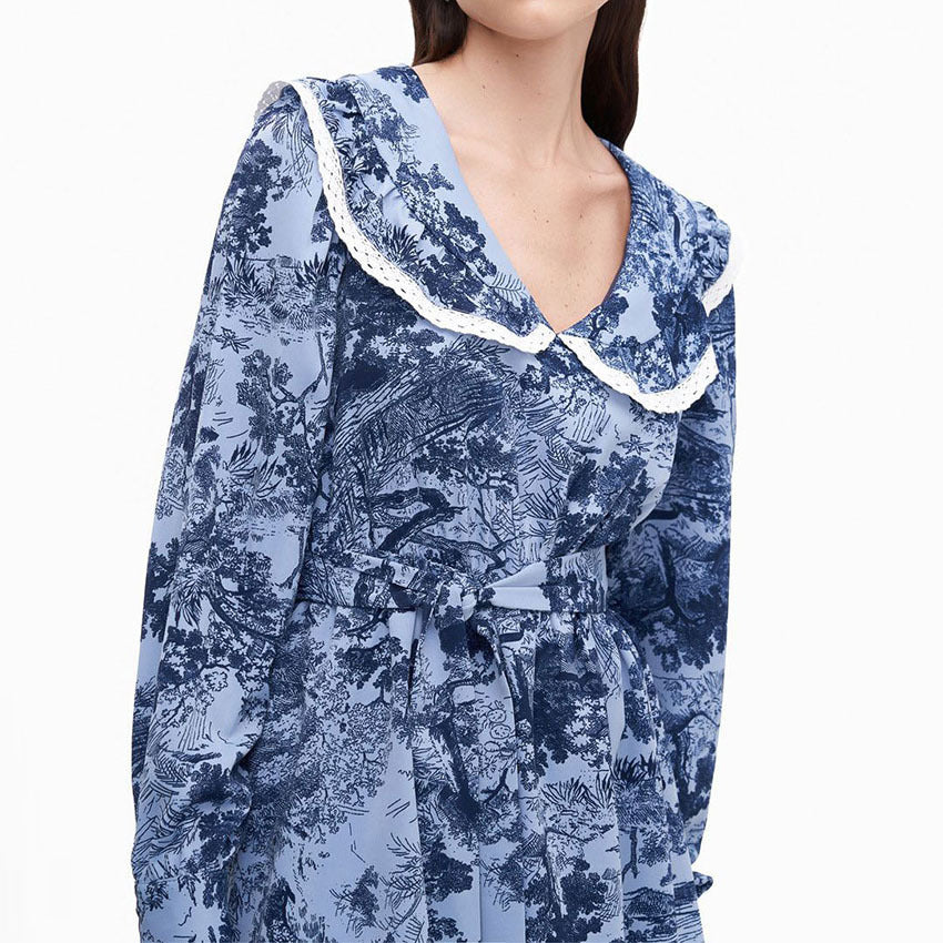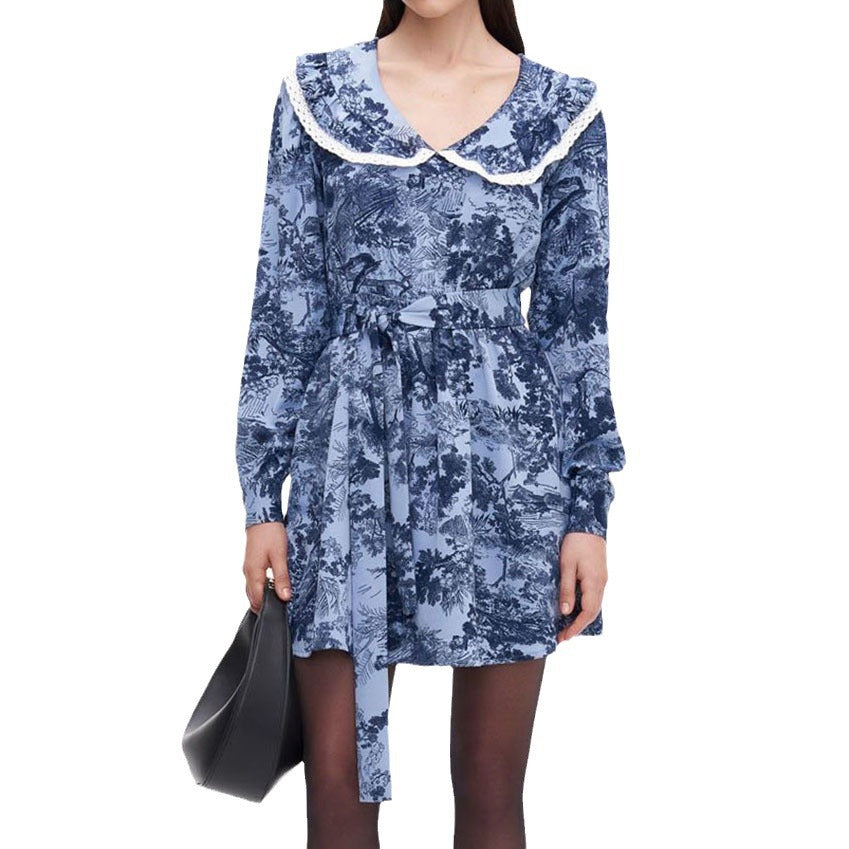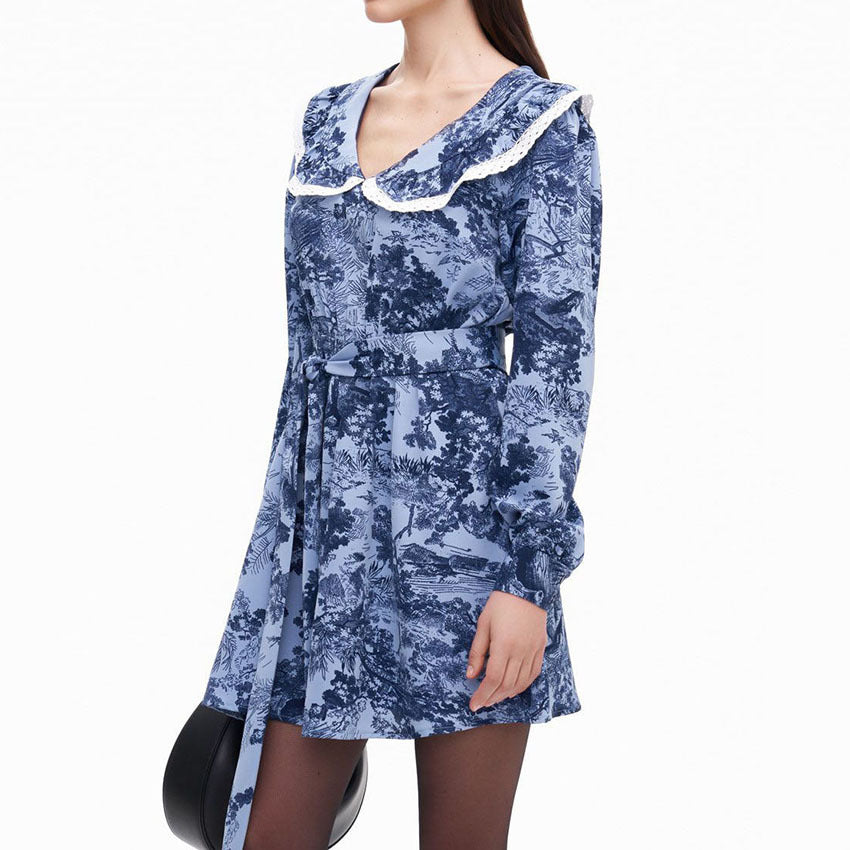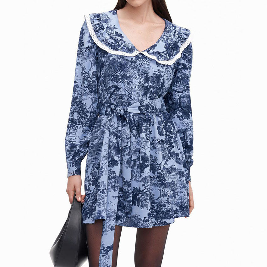 Autumn Sexy Touch Floral V-Neck Bubble Sleeve Dress With Stylish Bow Lace-Up Skirt