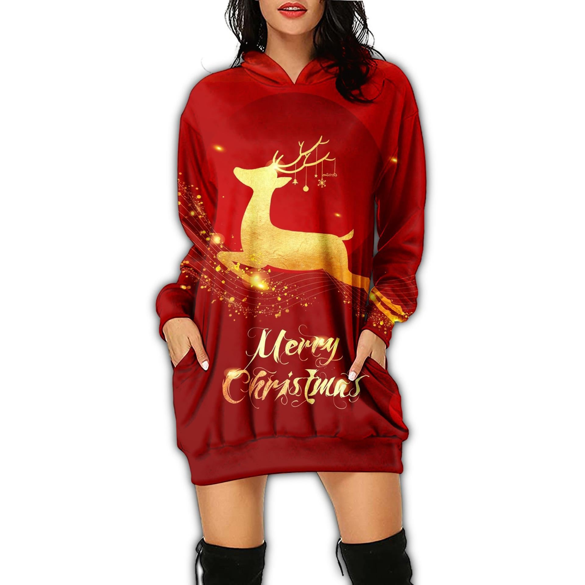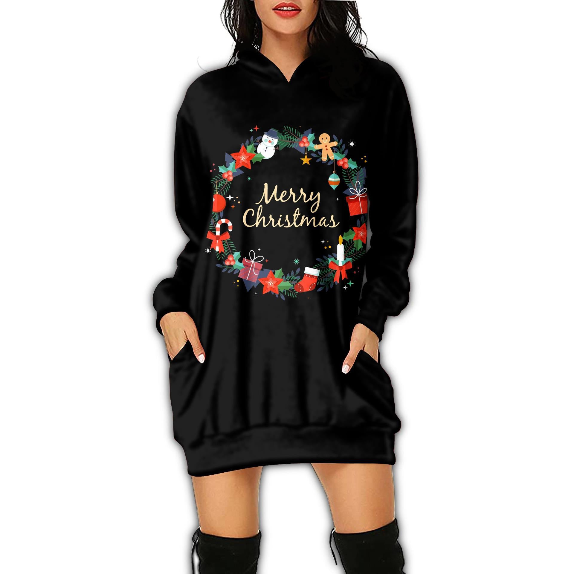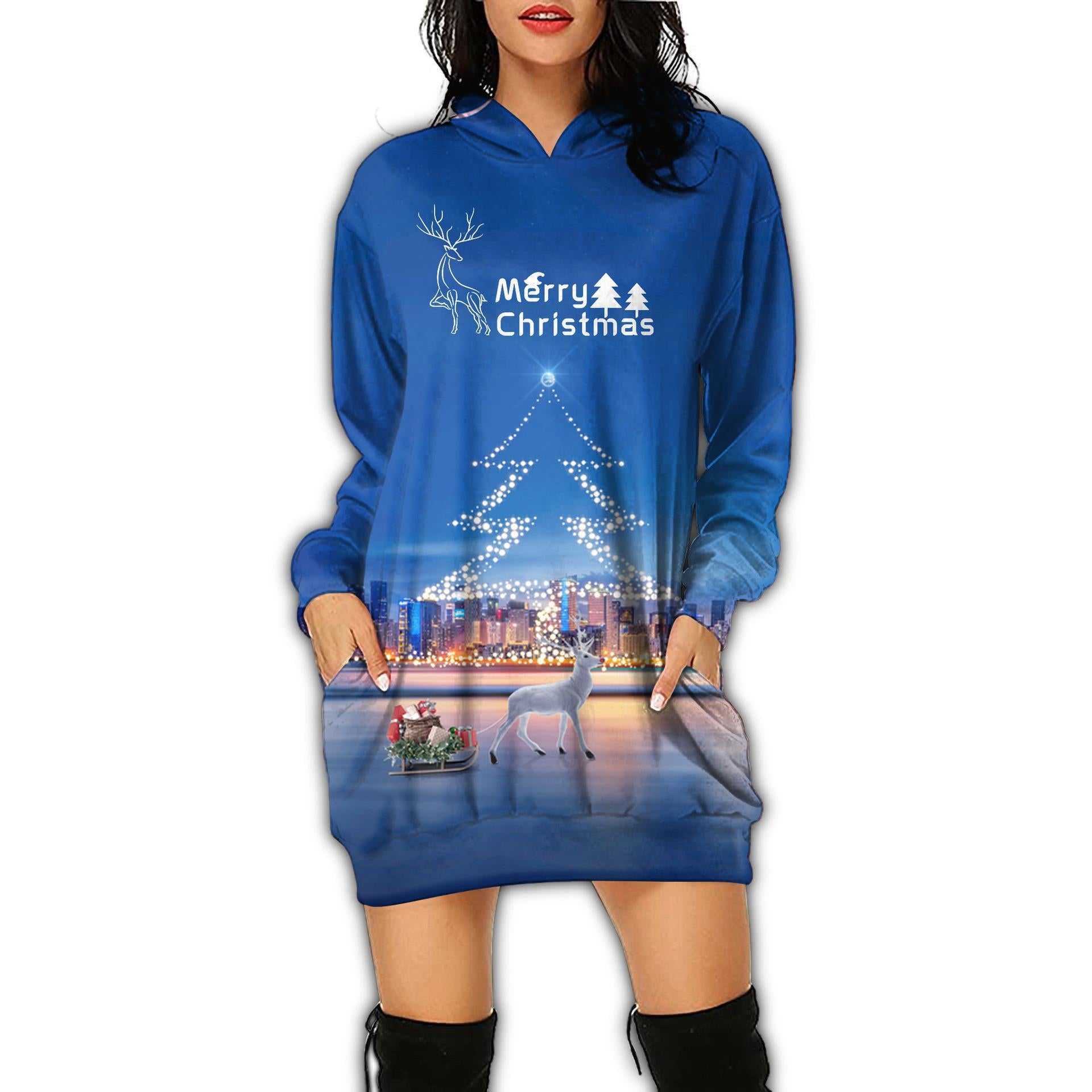 Autumn Women's Print Casual Long-Sleeved Hoodie Dress Christmas Holiday Party Dress