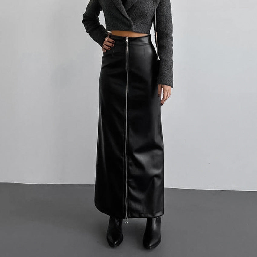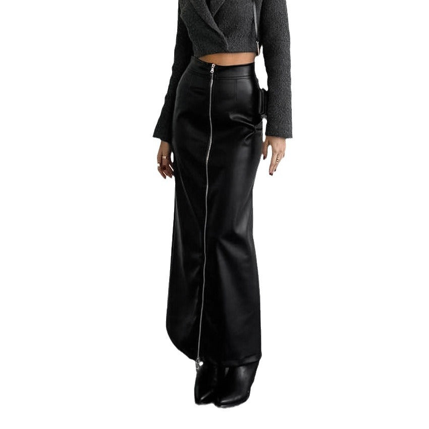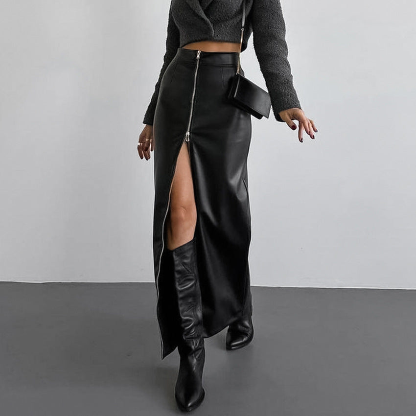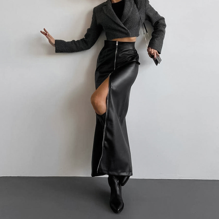 Black Velvet Faux Leather Sexy Slit High Waist Skirt New Fall Fashion Woman