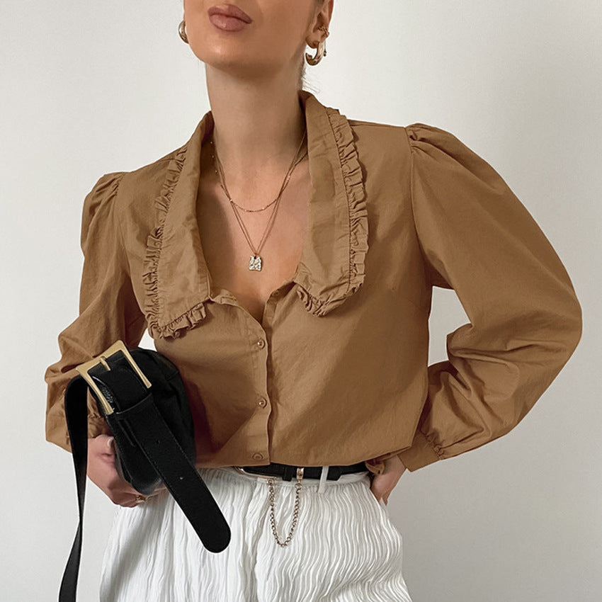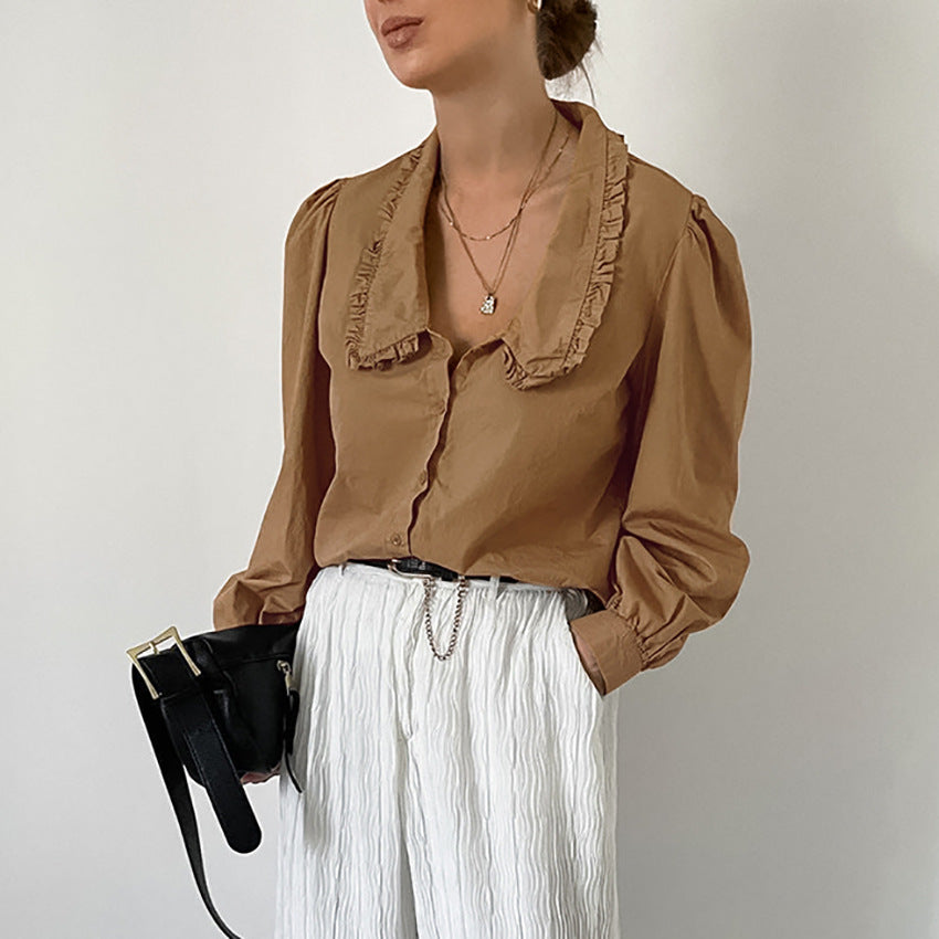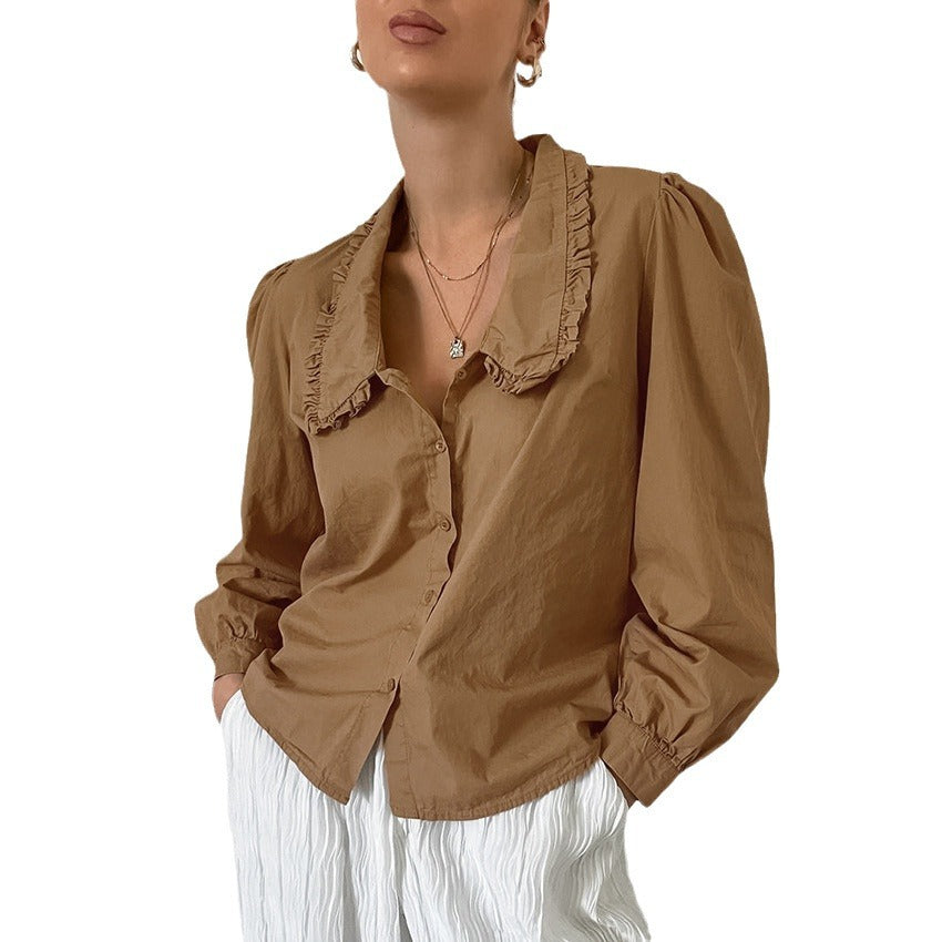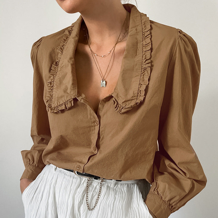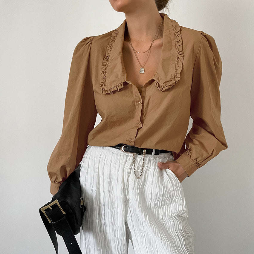 Brown Cotton Pleated Baggy Lapel Blouse New Fall Fashion Top