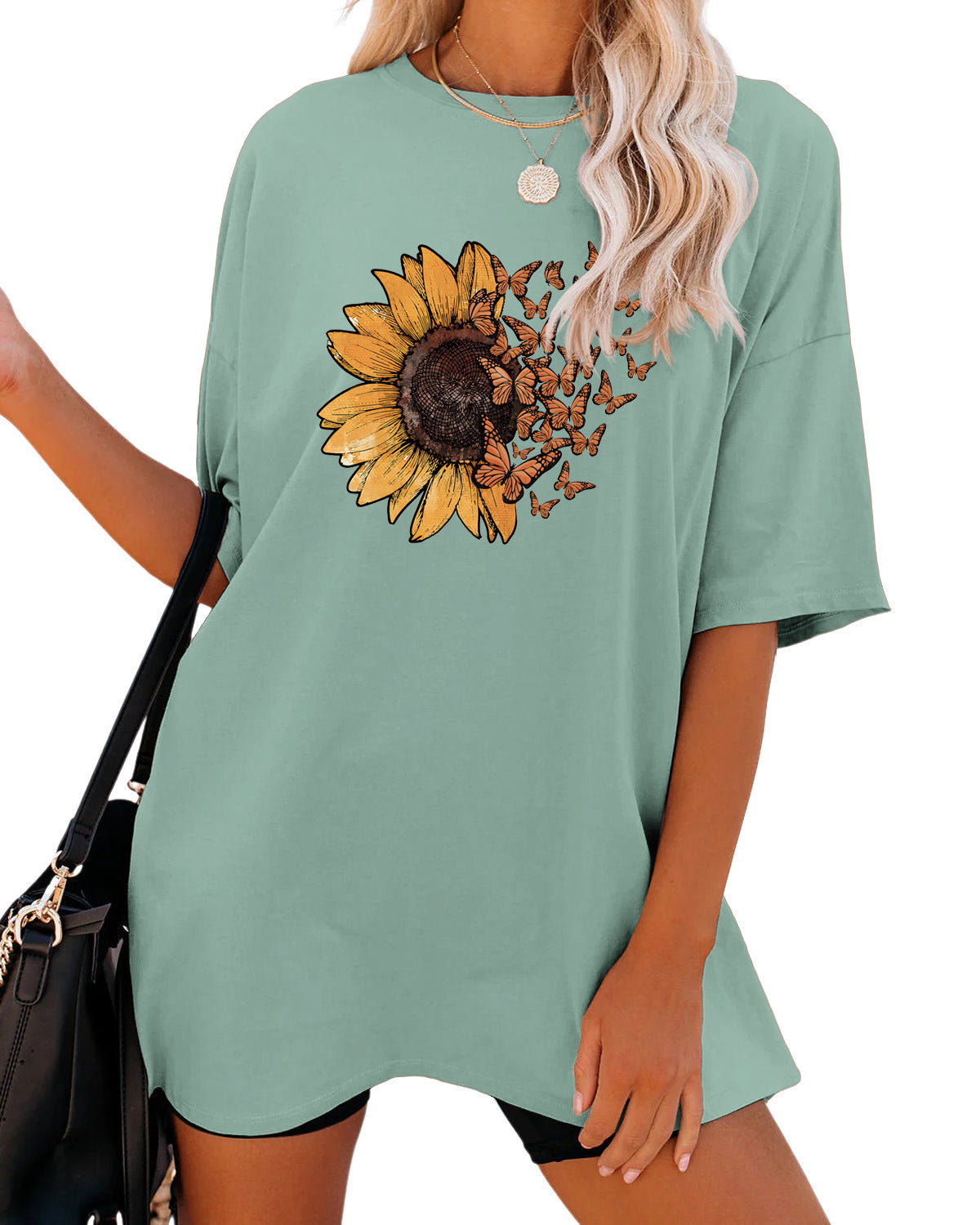 Casual Sunflower Print Loose T-Shirt Women's Round Neck Fashion Short Sleeve Shirt