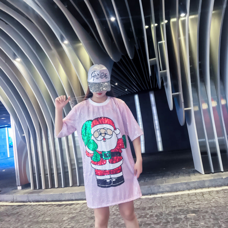 Christmas Santa Women Plus Size Loose Dress Sequined Long T-Shirt Woman