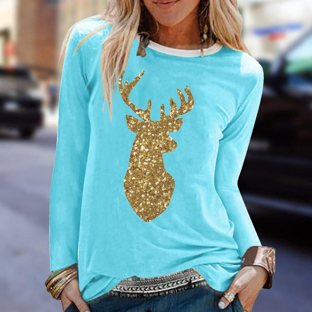 Cross Fall New Ladies Christmas Sequined Antler Print Ladies Fresh Sweet Long Sleeve T-Shirt