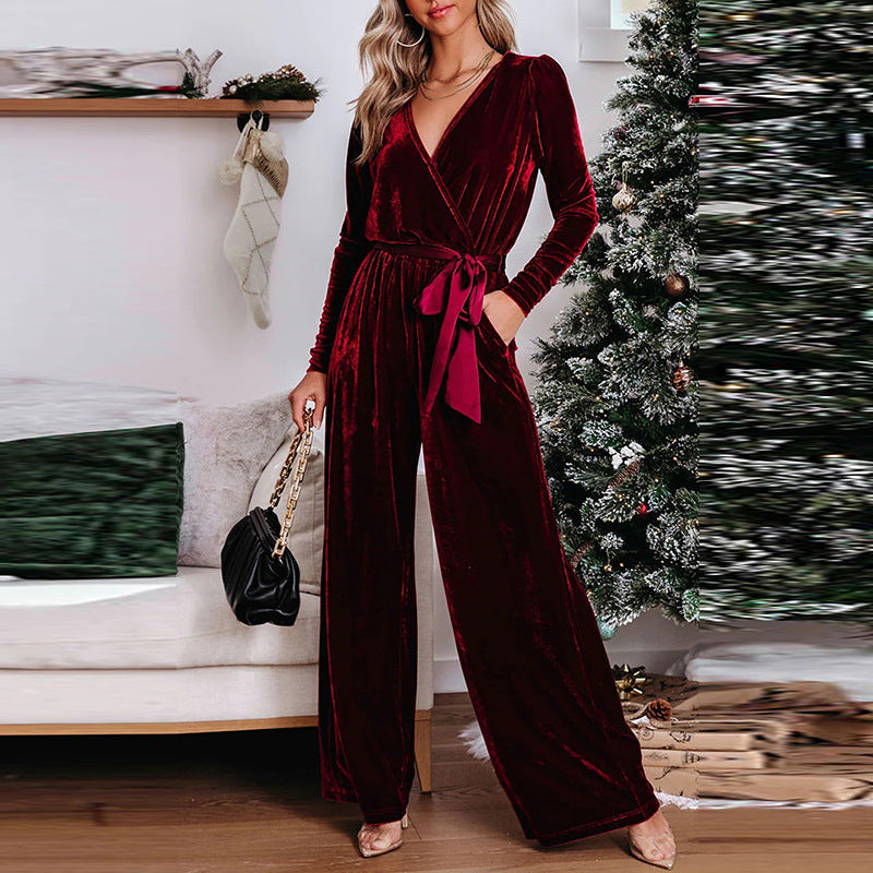 Fall New Solid Color Velvet Wide Leg Pants Ladies Commuter Style Lace-Up Jumpsuit Women