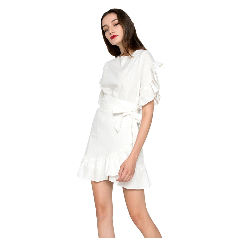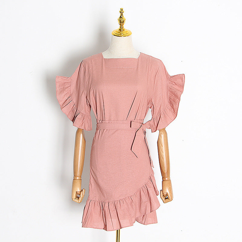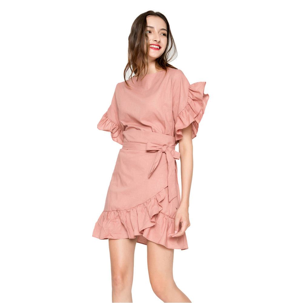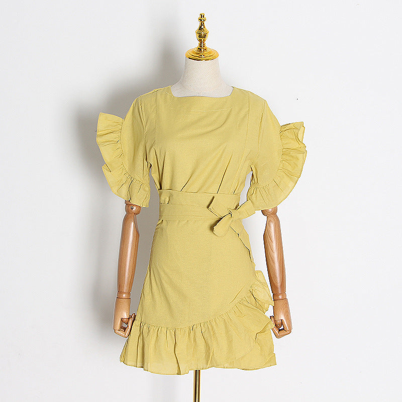 Fashion Adjustable Belt Ruffled Stitching A Line Skirt Spring New Cotton And Linen Dress Women's Tide