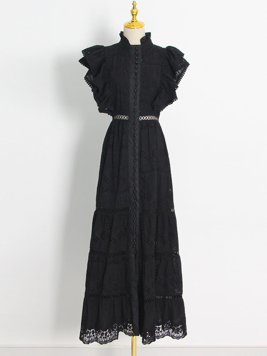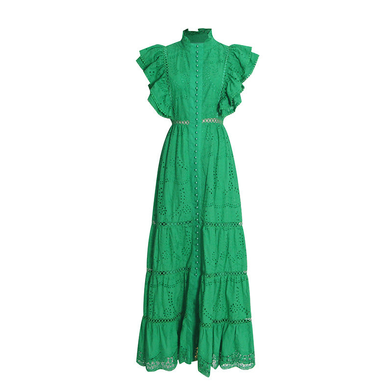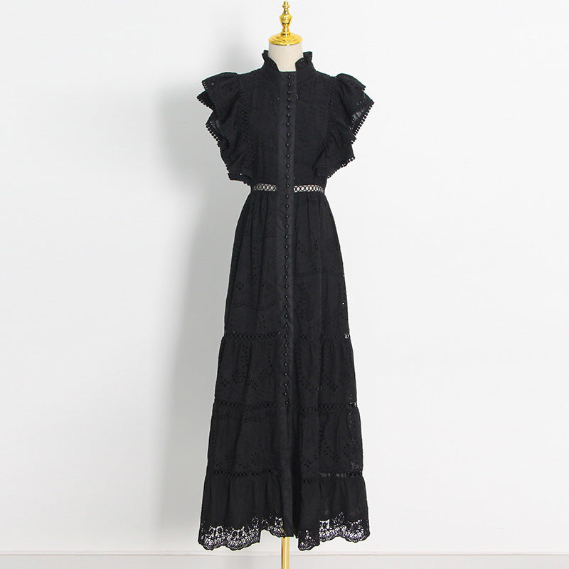 Fashion Solid Color Long Dress Spring New Fashion High-Neck Sleeveless Hollow Embroidery Dress