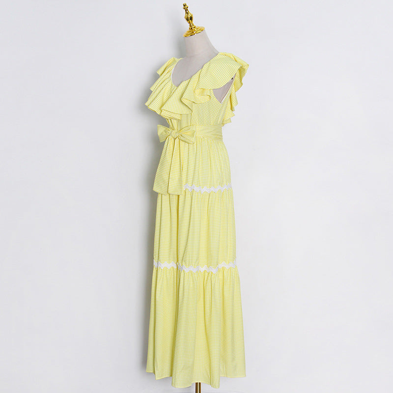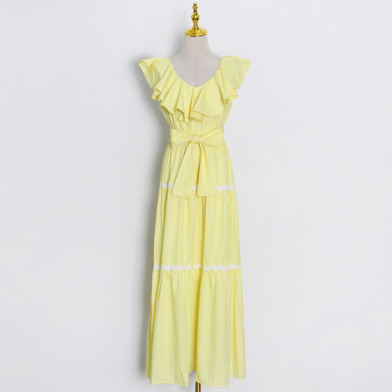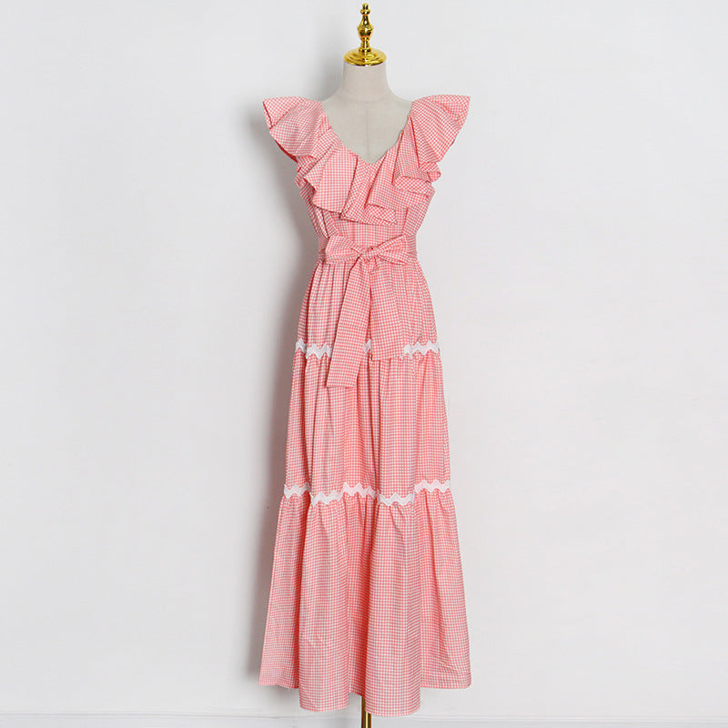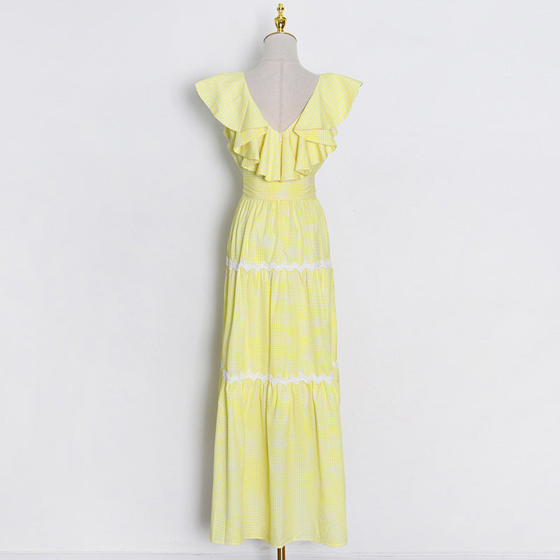 Fashion Early Spring New V-Neck Ruffled Check Splicing High Waist A Word Big Swing Temperament Long Dress Woman
