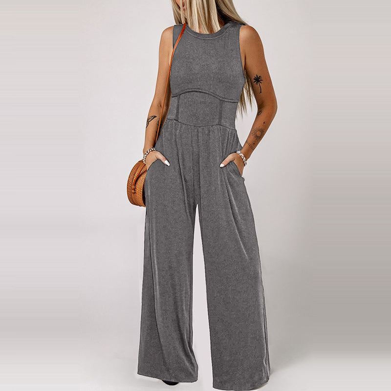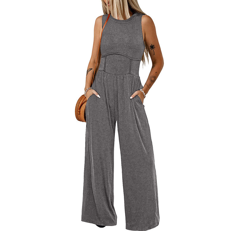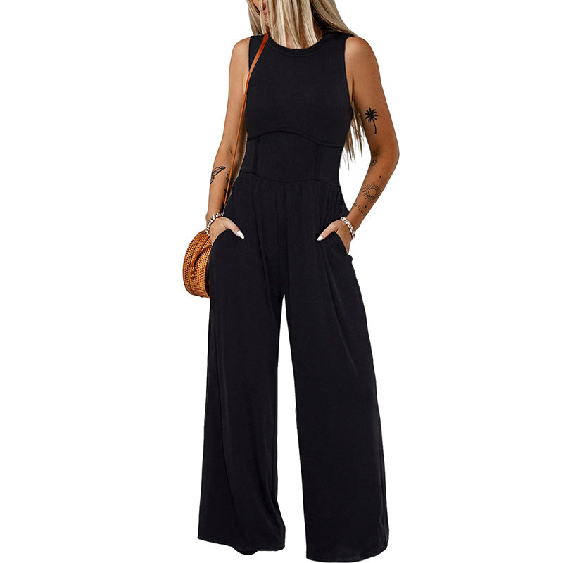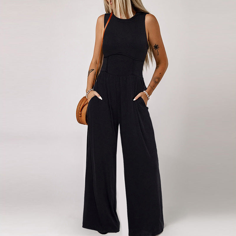 Fashion Simple Round Neck Sleeveless Jumpsuit Women Summer New Casual High Waist Wide Leg Pants Women