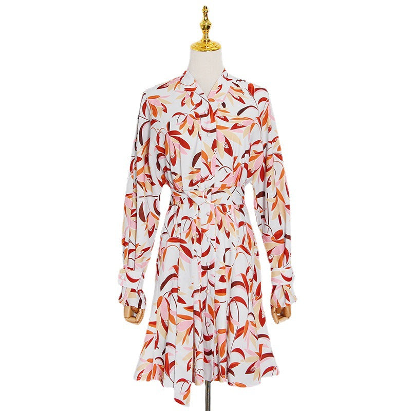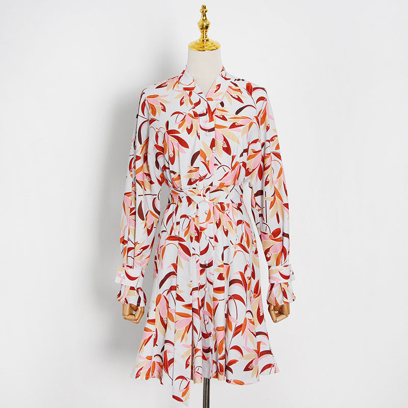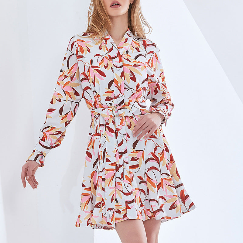 Garden Print Spring Button-Down Front Long-Sleeved Short Waistline V-Neck Dress