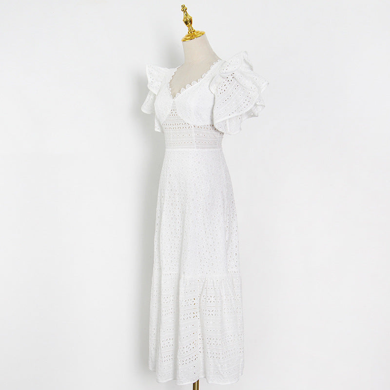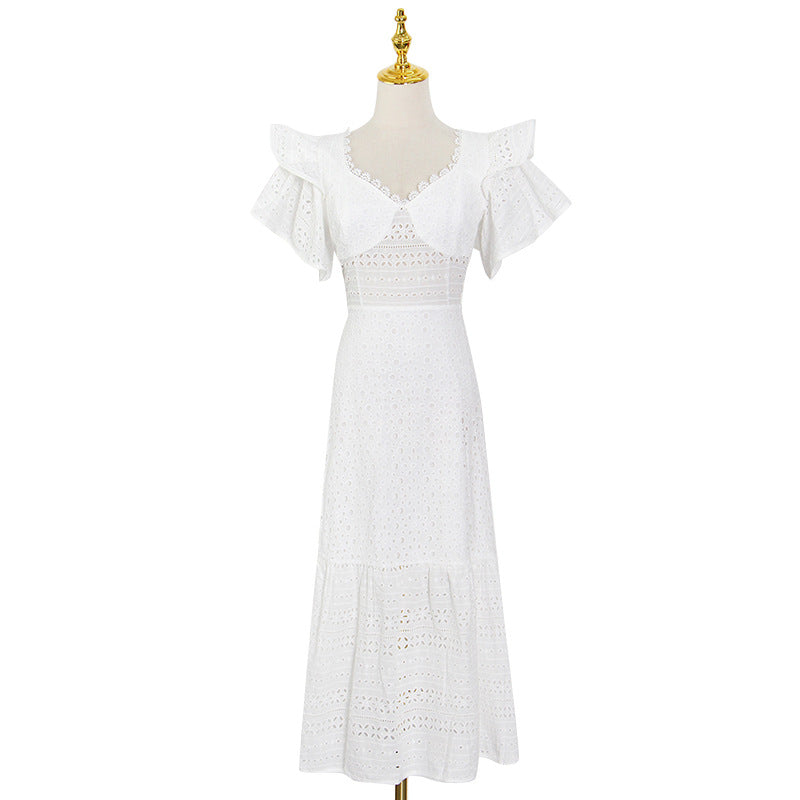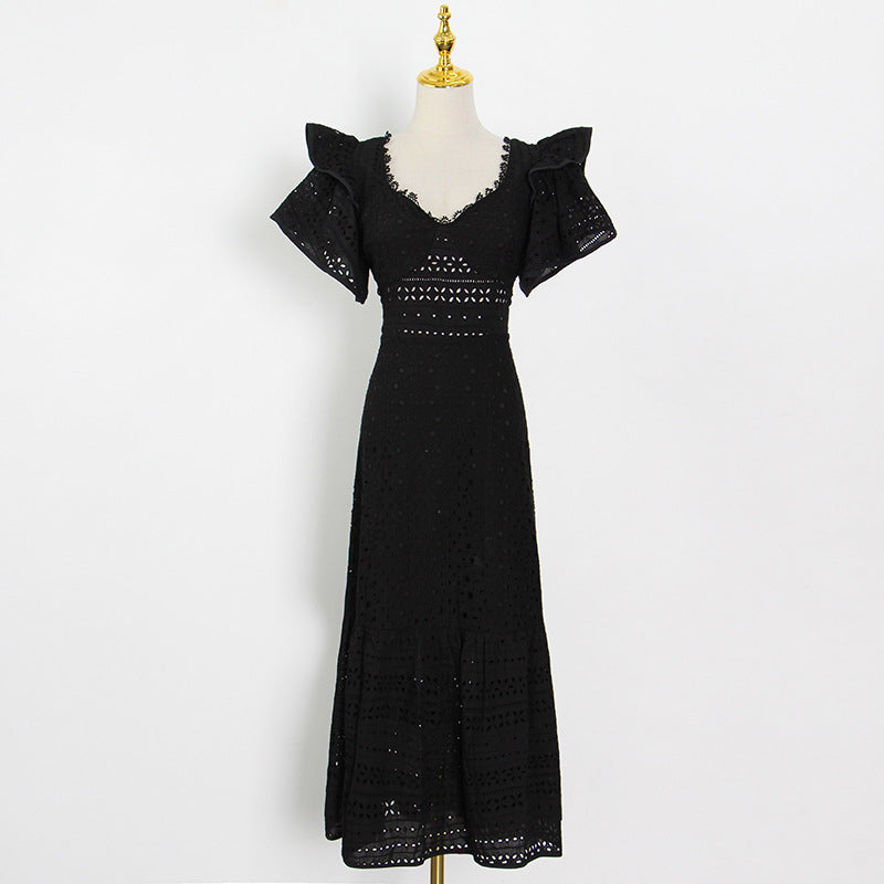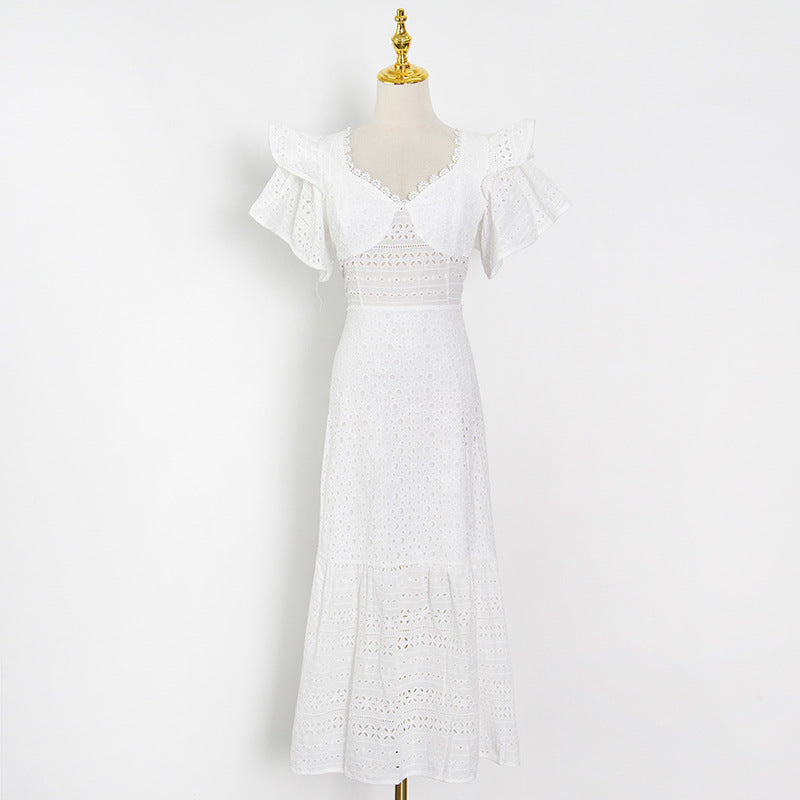 Solid Color Big Skirt Spring Crocheted Lace Square Collar Flying Sleeve Long Slit Dress