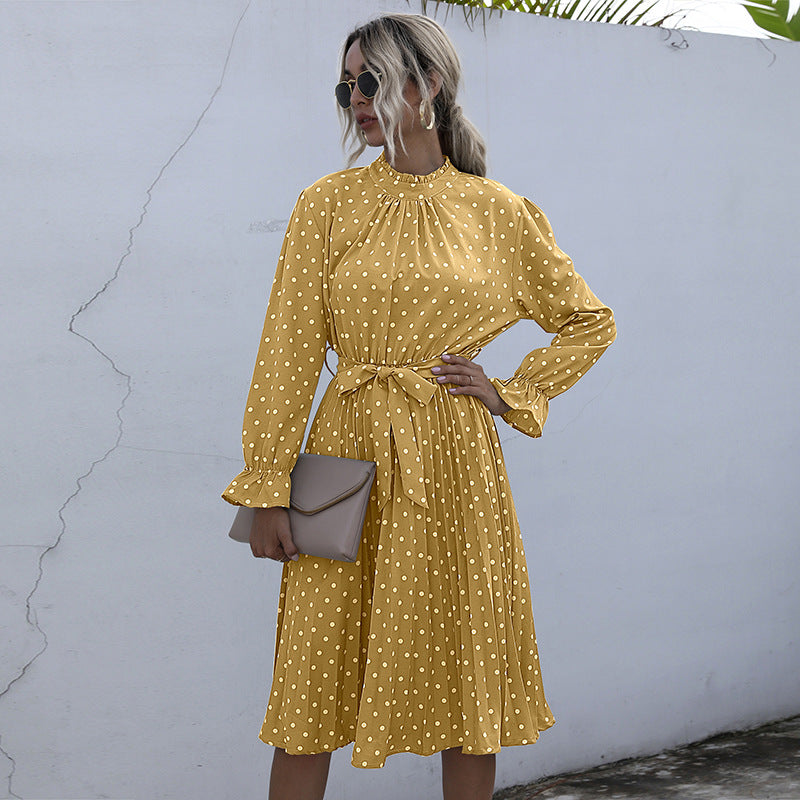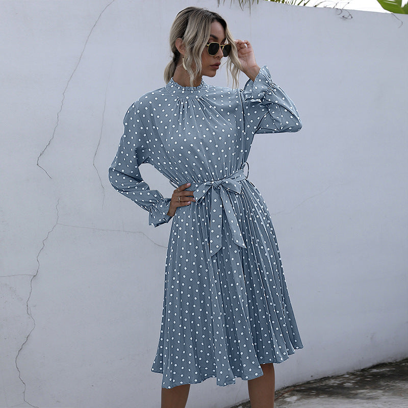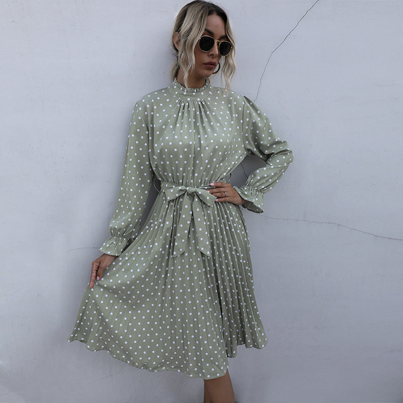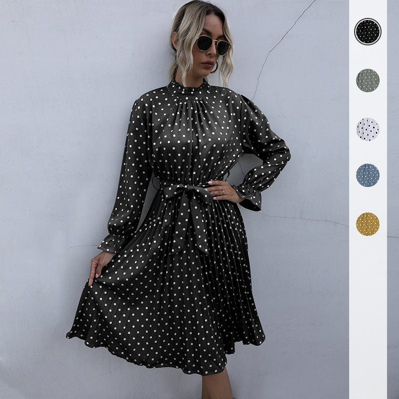 Hot Retro Women's Pleated High-Neck Polka-Dot Long-Sleeved Slim-Fit Dress