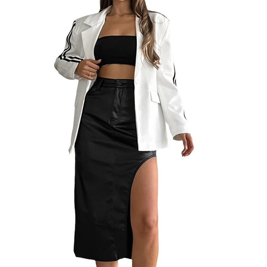 Khaki And Velvet Faux Leather Stretch Slit Skirt New Fall Fashion Women's Dress