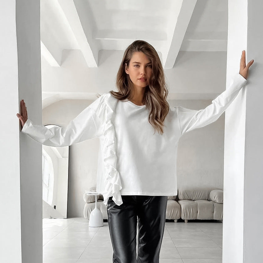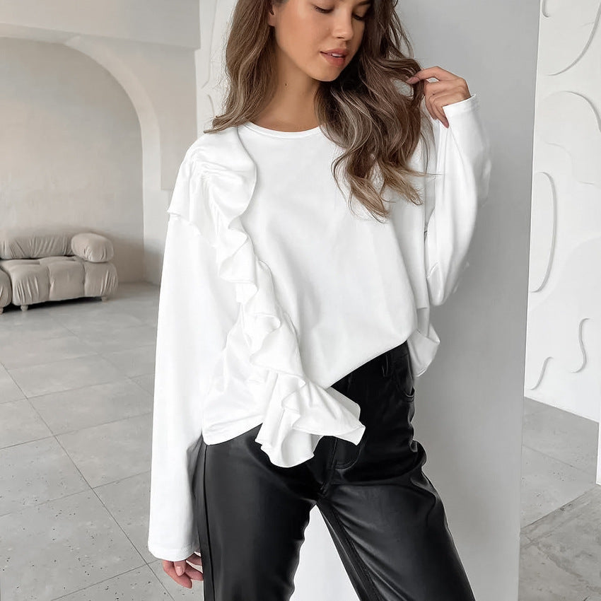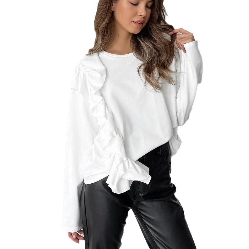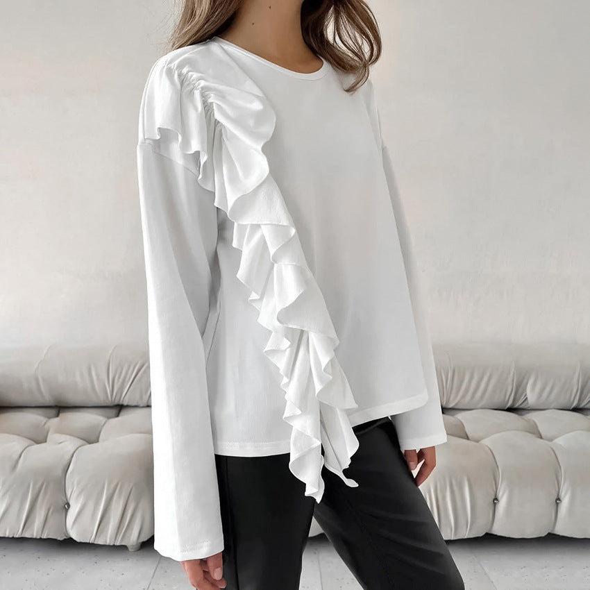 Knitted Pure Cotton White Round Neck Long Sleeve Ruffled T-Shirt With Loose Top Small Autumn Dress Woman