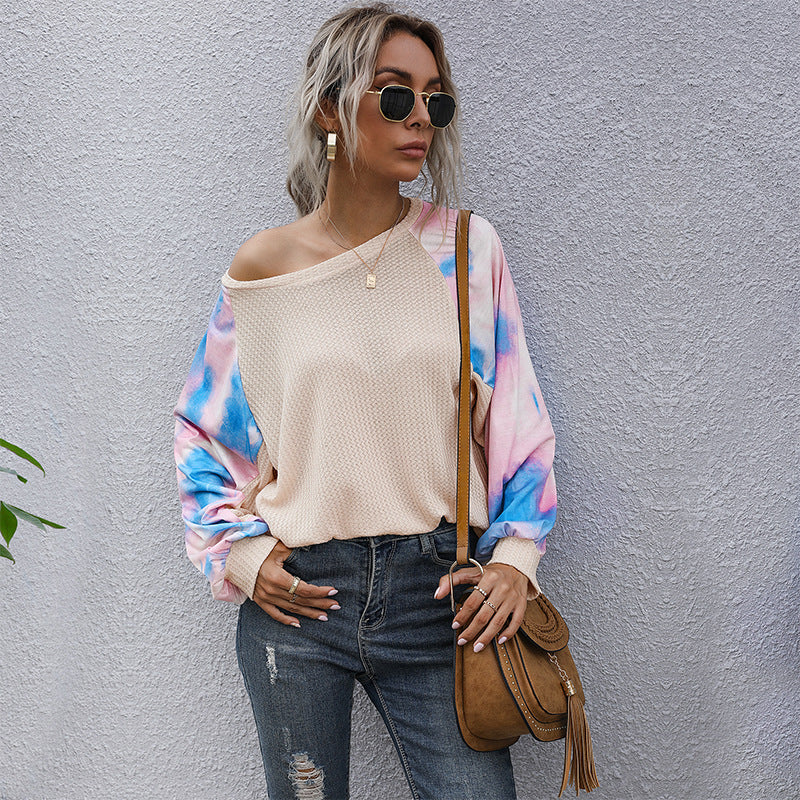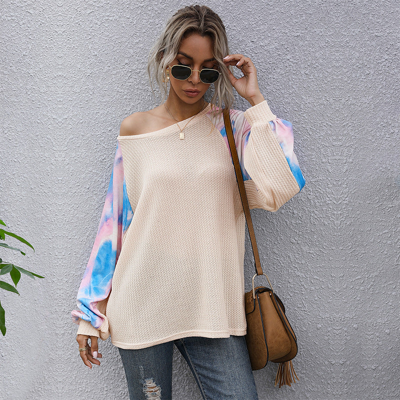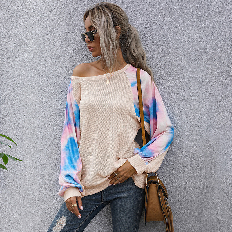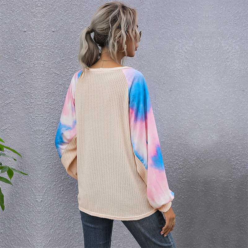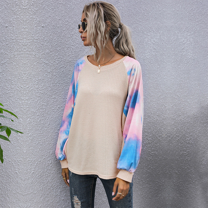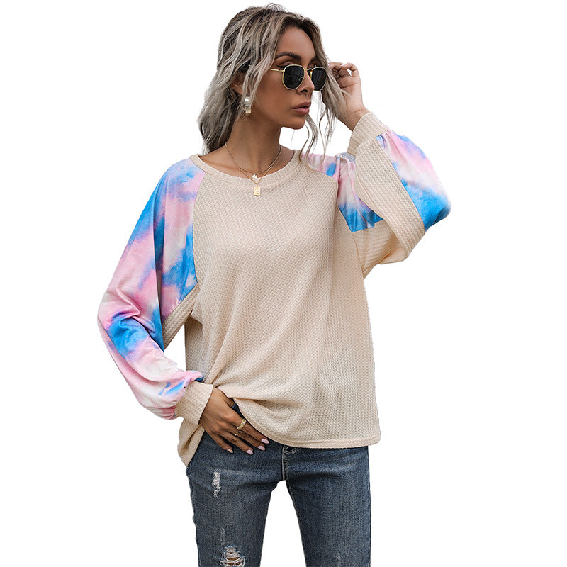 Loose Top Fashion Casual Crew-Neck Splicing Long-Sleeved Tie-Dyed White T-Shirt