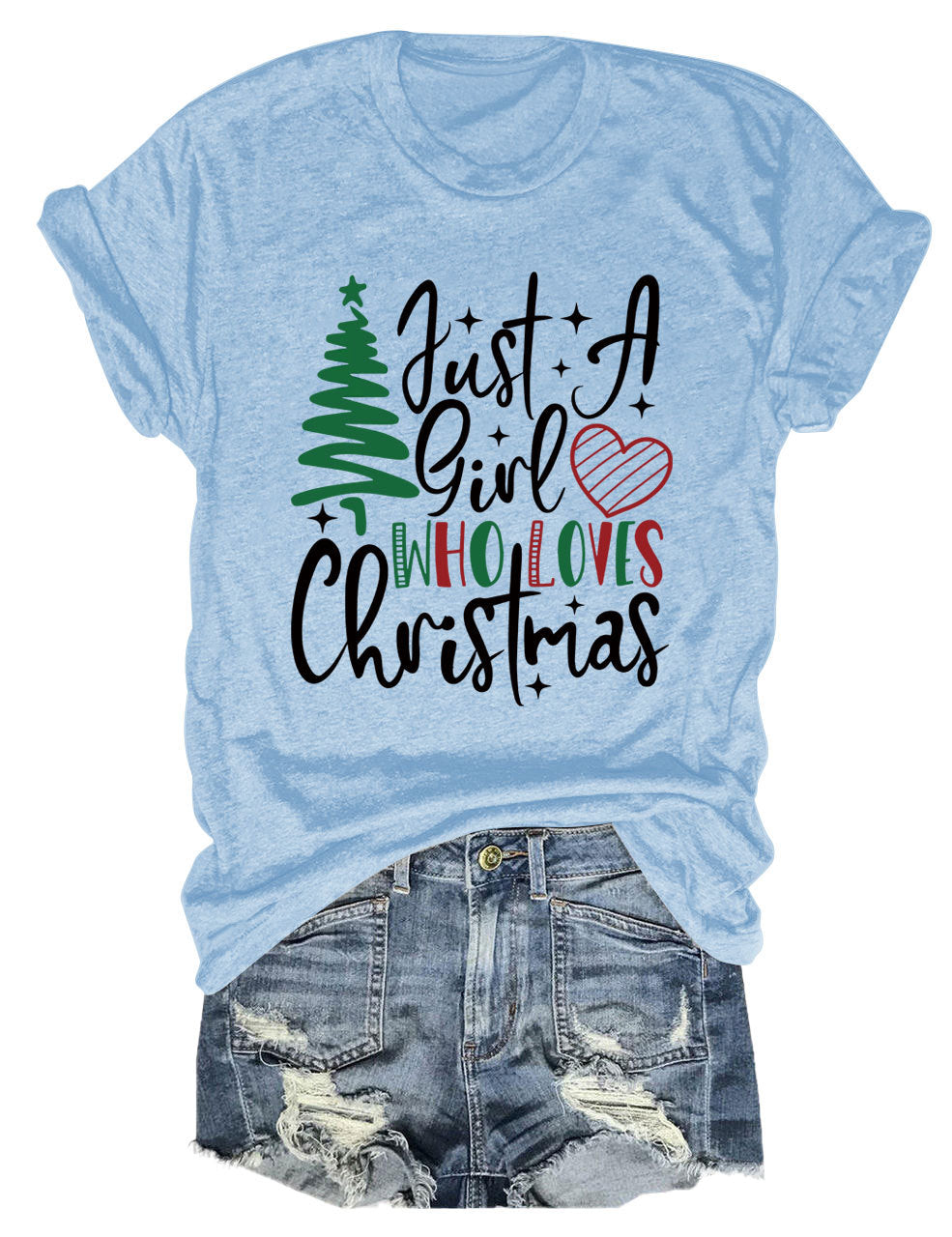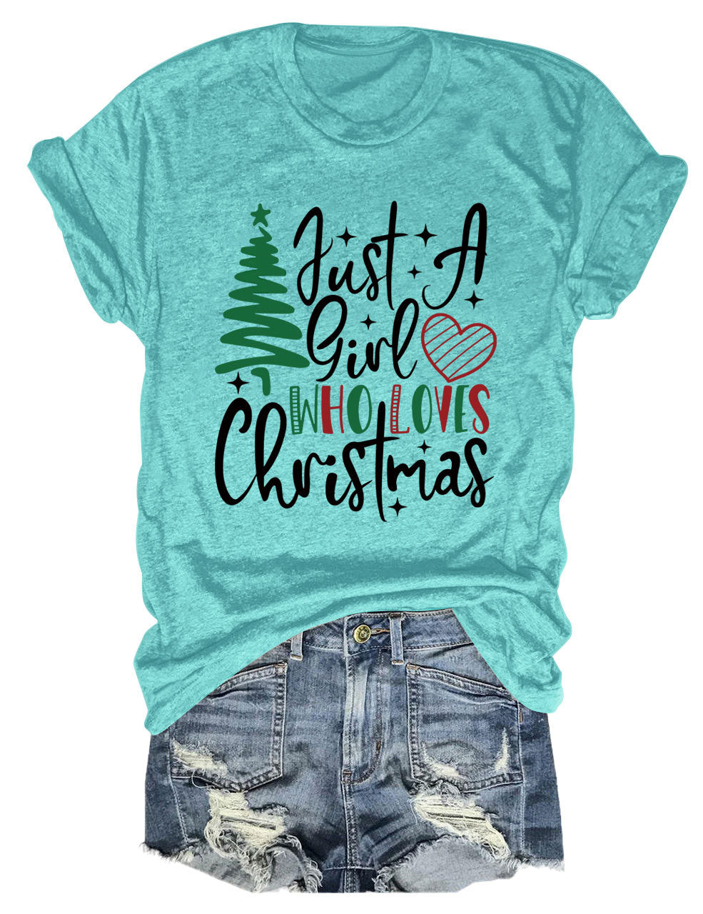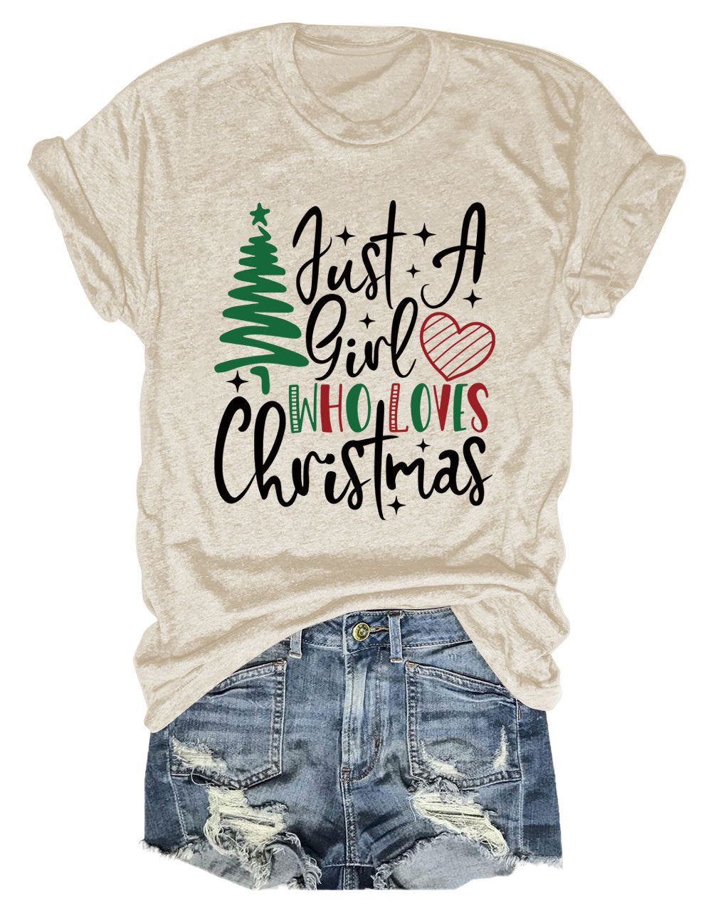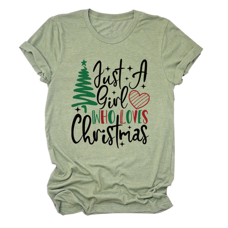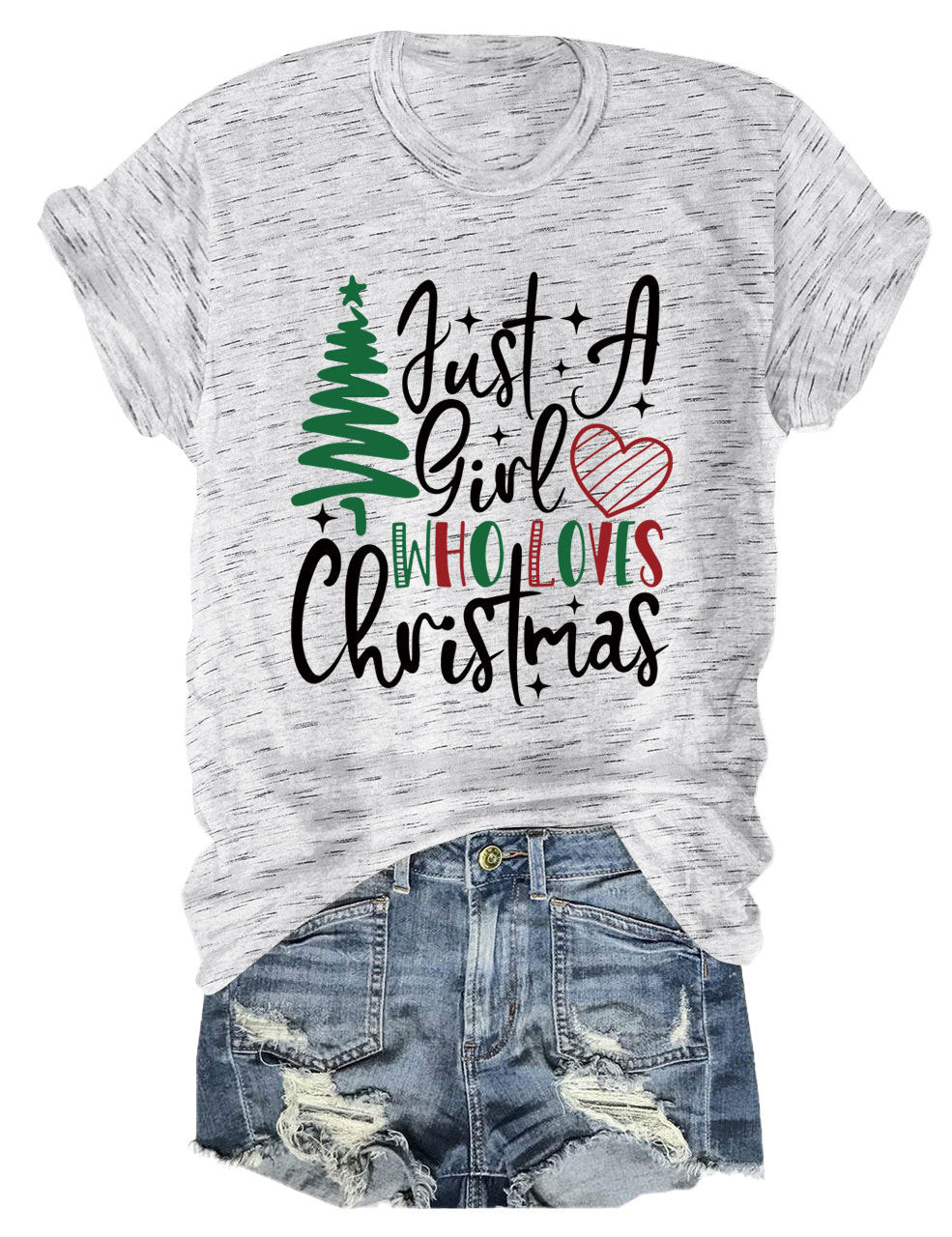 New Just A Girl Fun Christmas Tree Print Round Neck Short Sleeve Female Spot