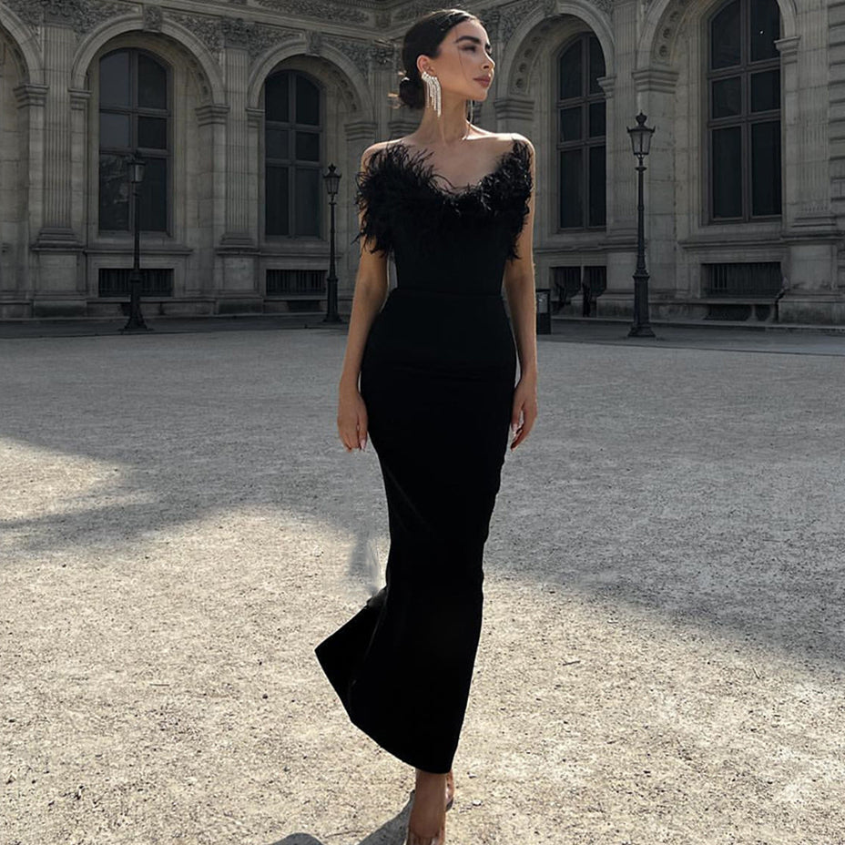 New Strapless Bandage Dress Fashion Feather Elegant Tight Wrap Hip Sleeveless Party Banquet Dress
