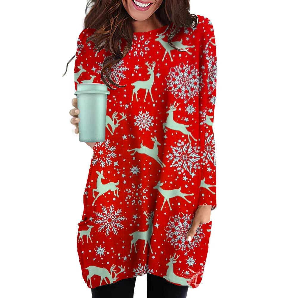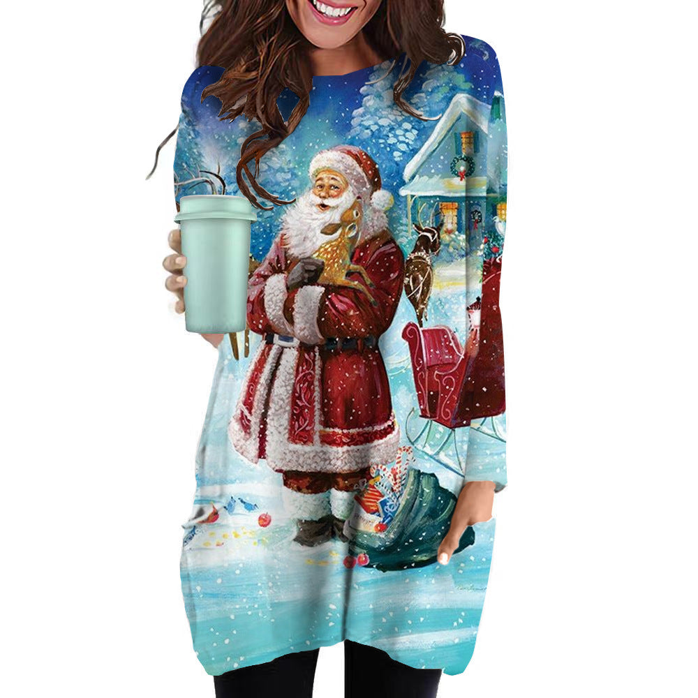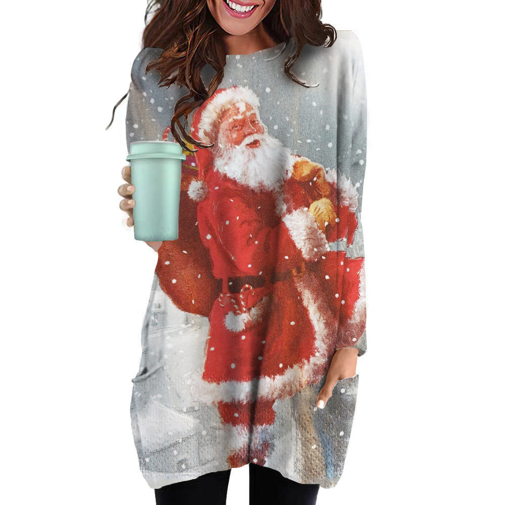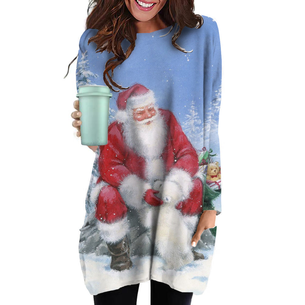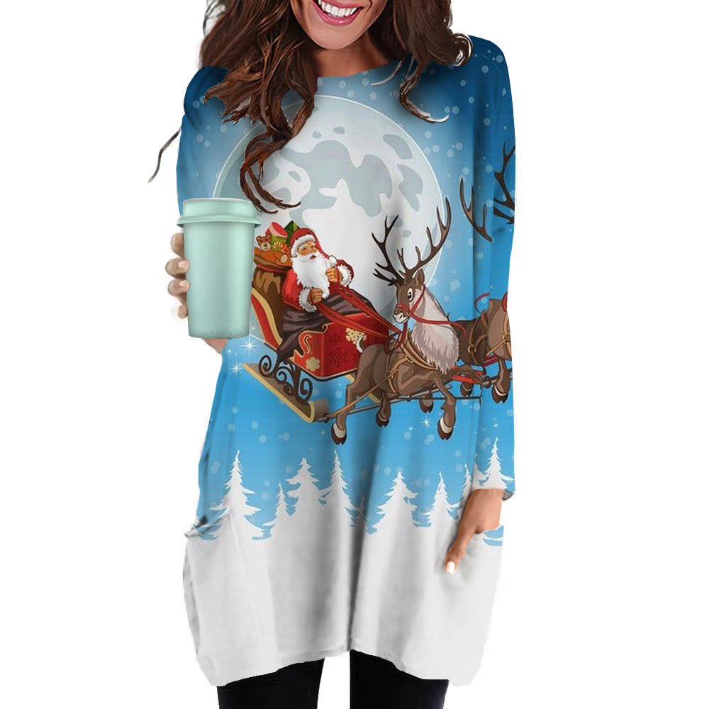 Women's Loose Round Neck 3D Christmas Elements Printed Long T-Shirt A Hair Casual Hoodie