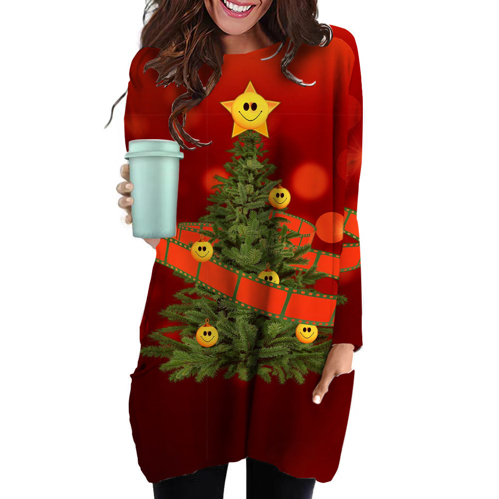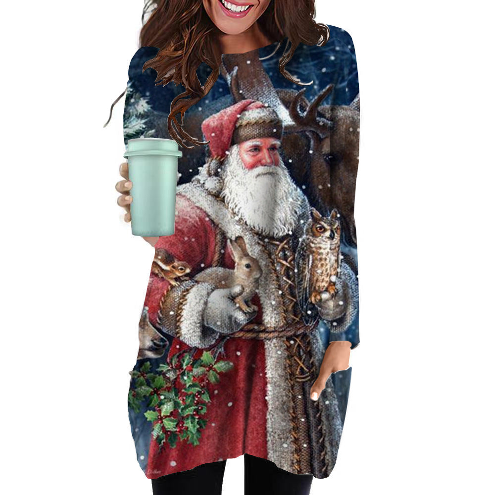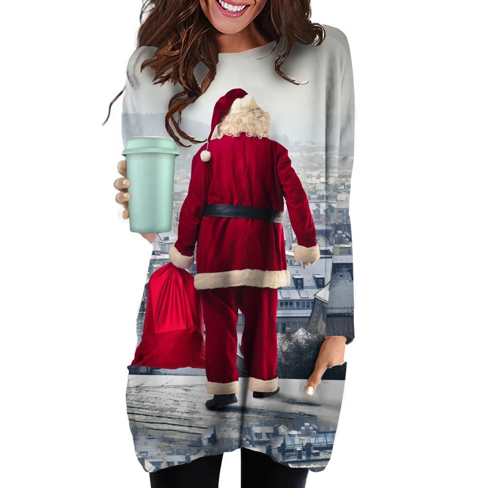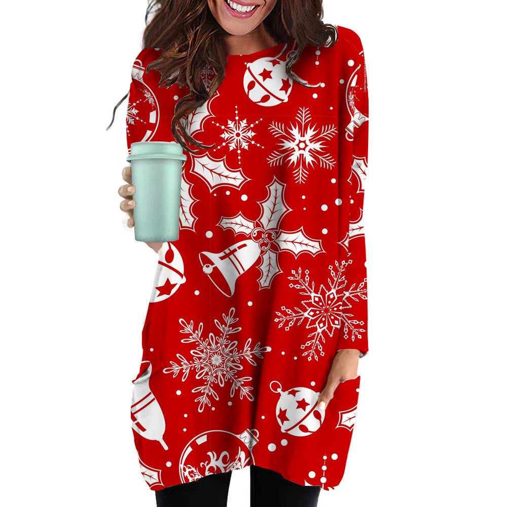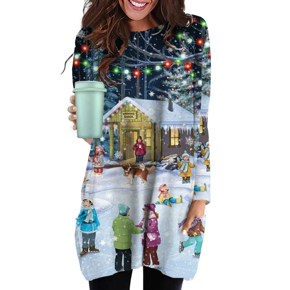 Women's Loose Round Neck 3D Christmas Elements Printed Long T-Shirt A Hair Casual Hoodie