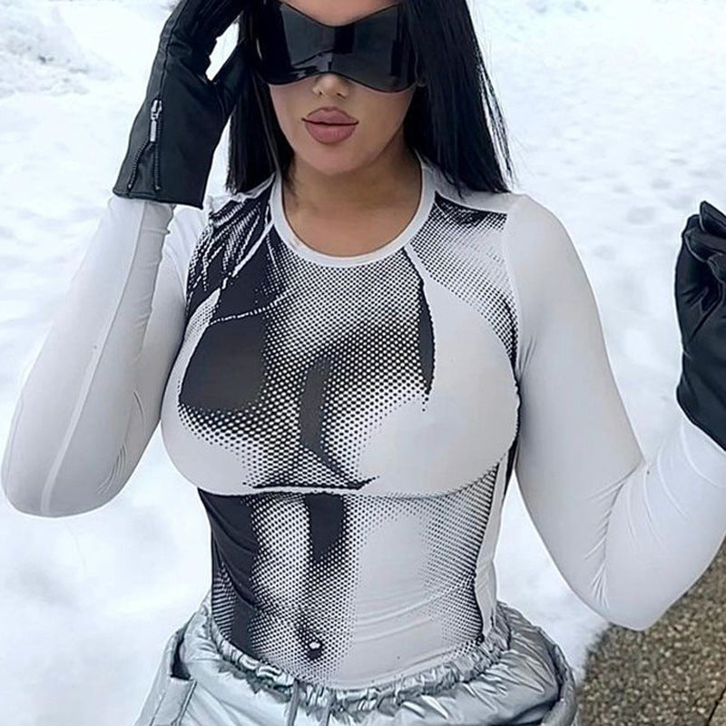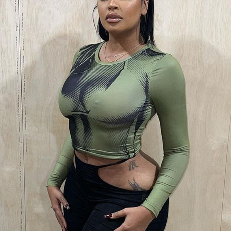 Personality Trend Sexy Short Women's Print Round Neck Slim Long Sleeve T-Shirt Large Size Fat Mm Tight Top