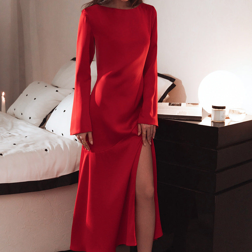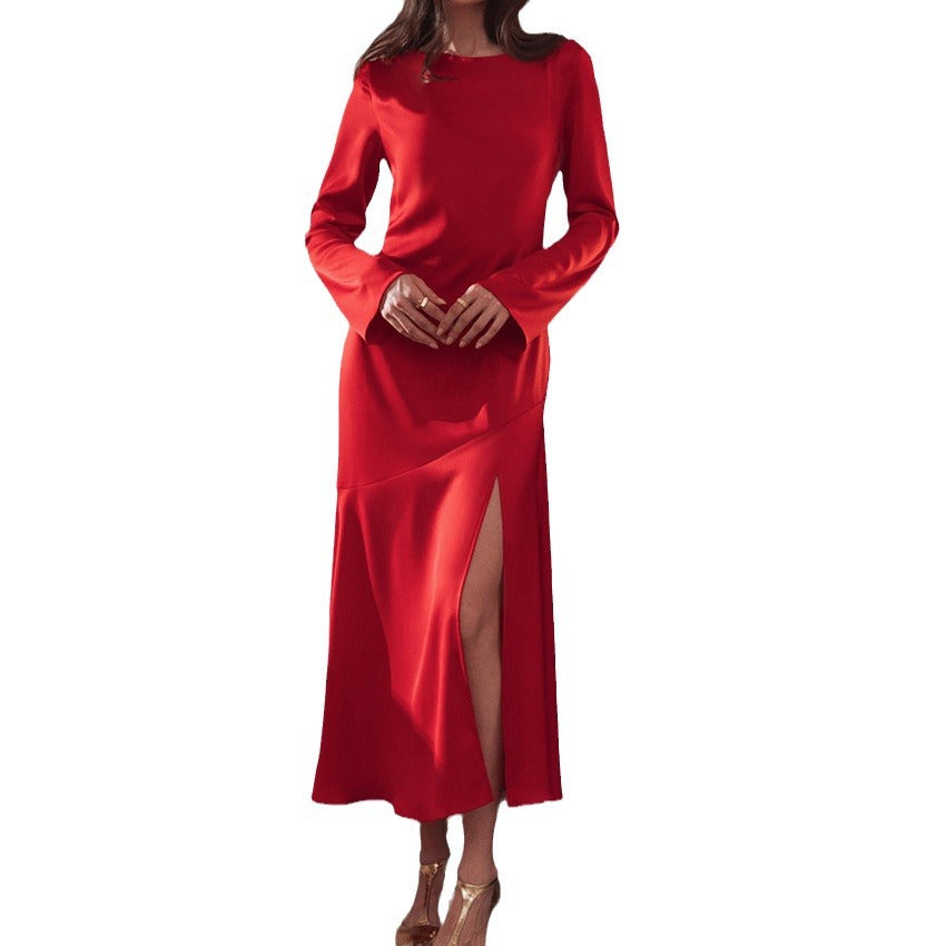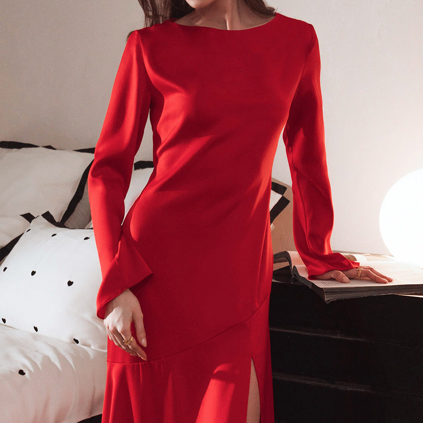 Sexy Acetate Color T-Horn Sleeve Side Slit Dress New Spring Fashion