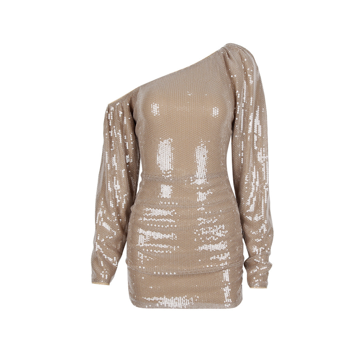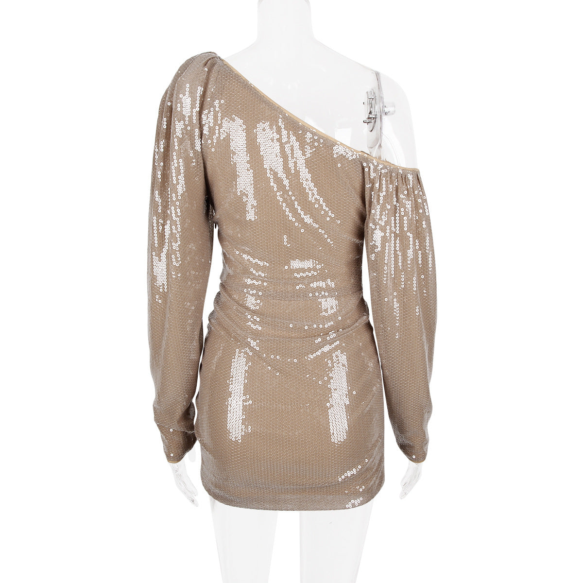 Sexy Nightclub Spice Women's New Dress One-Shoulder Puffed Sleeve Slim-Fit Wrap Hip Skirt Long Sleeve Sequin Dress