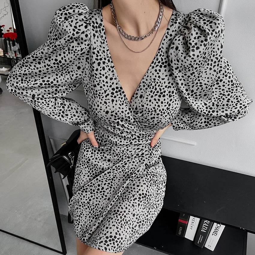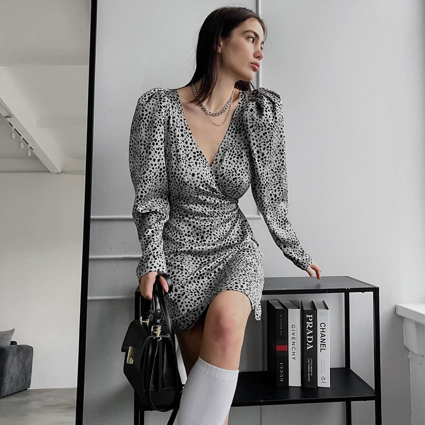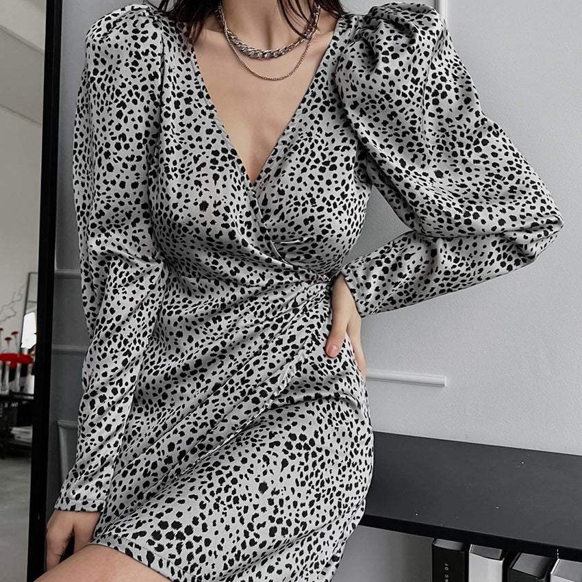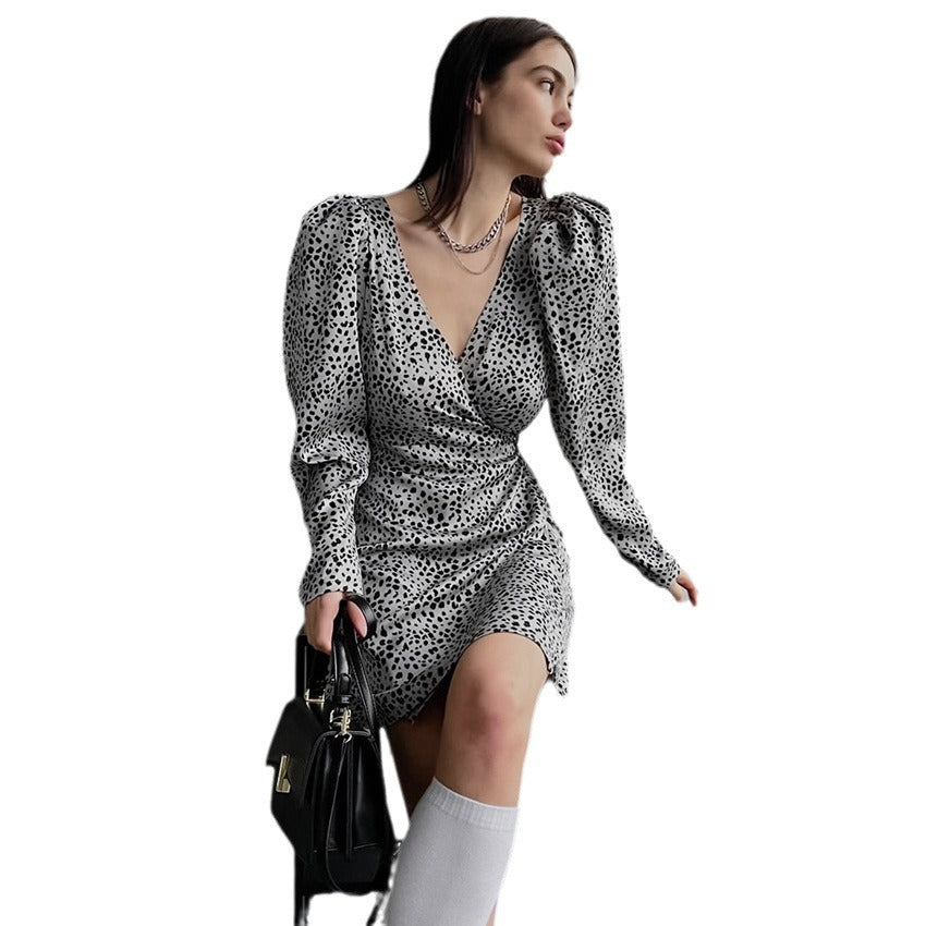 Sexy V-Neck Puffy Sleeve Print Wrap Dress New Spring Fashion Skirt For Women