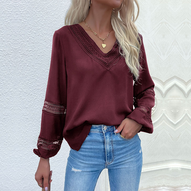Spring And Autumn Long-Sleeve Lace Stitching Shirt Set Head V-Neck Hollow Shirt Women's Wear