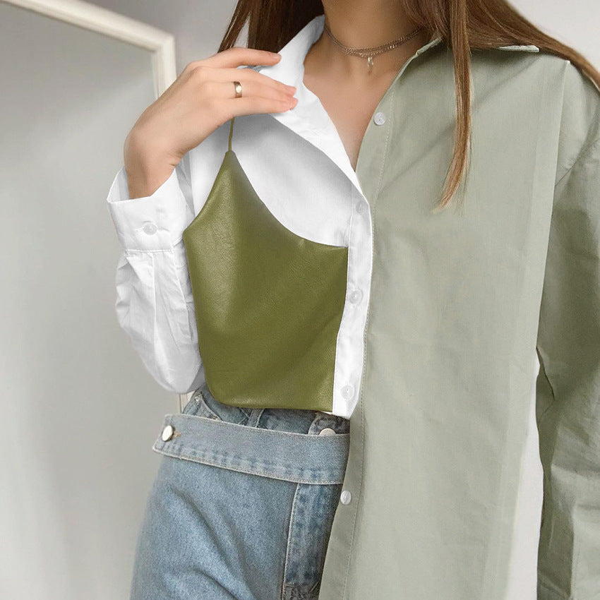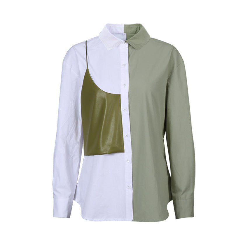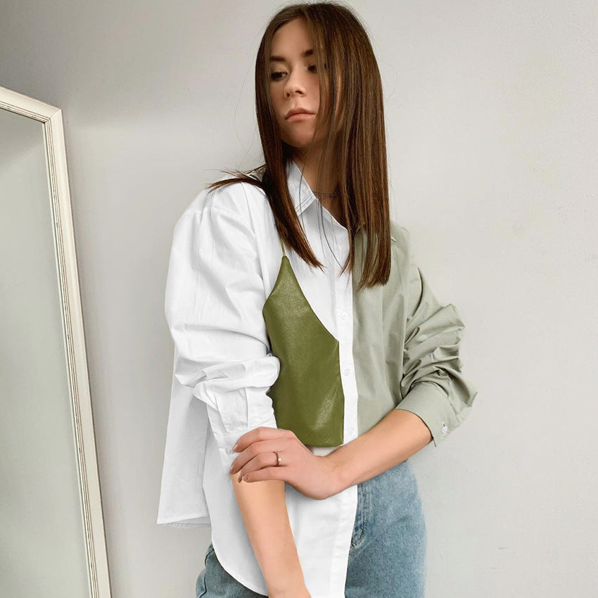 Spring Contrast Color Commuter Shirt Women's Design Sense Splicing Pu Leather Fake Two Long Sleeve Loose Shirt