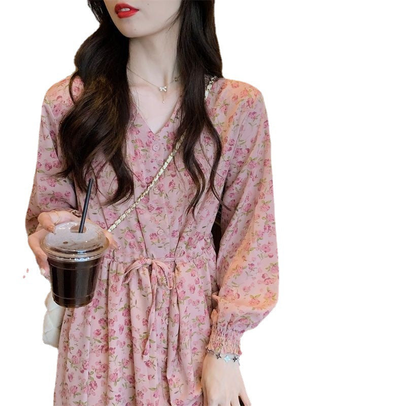 Spring Dress New Rose Tea Break Dress Flower Yao Print Temperament V-Neck Long Floral Dress Female