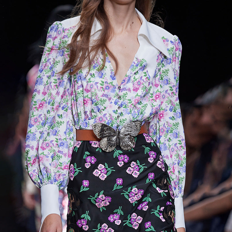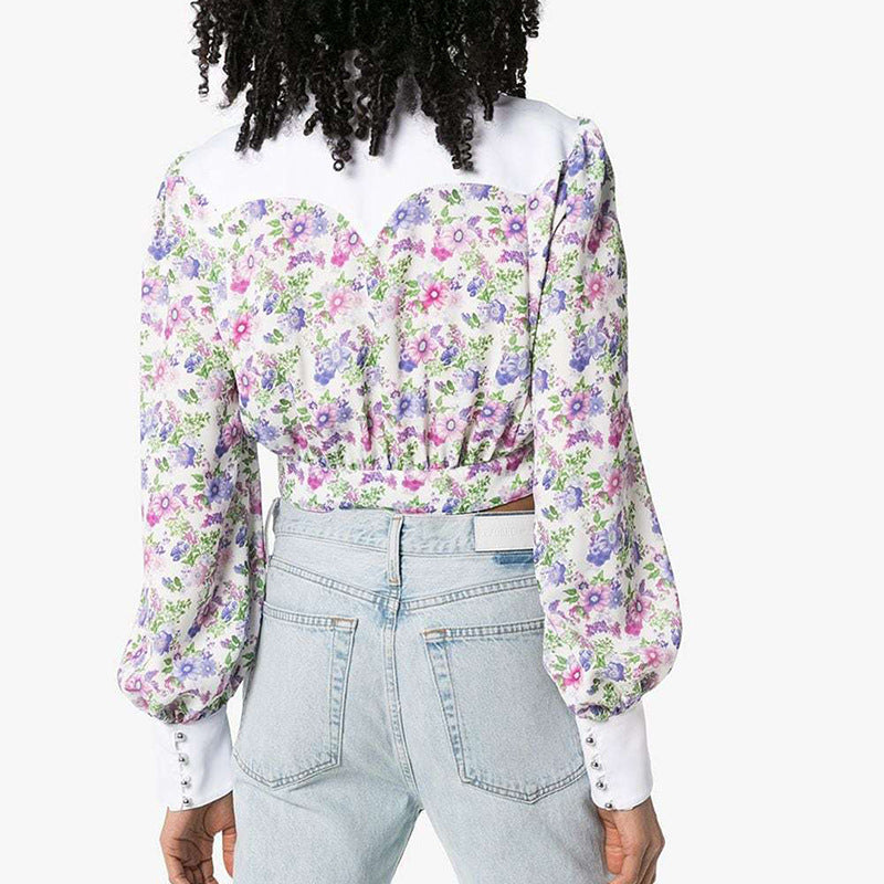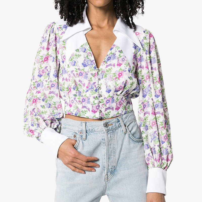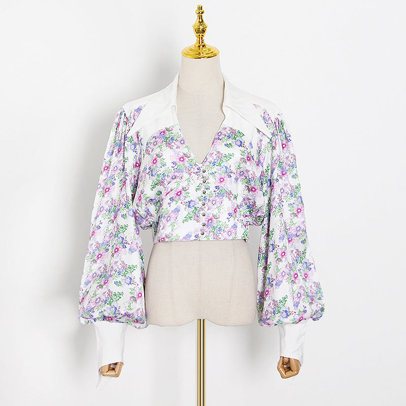 Spring New Elegant V-Neck Print Lantern Sleeve Short Shirt Woman