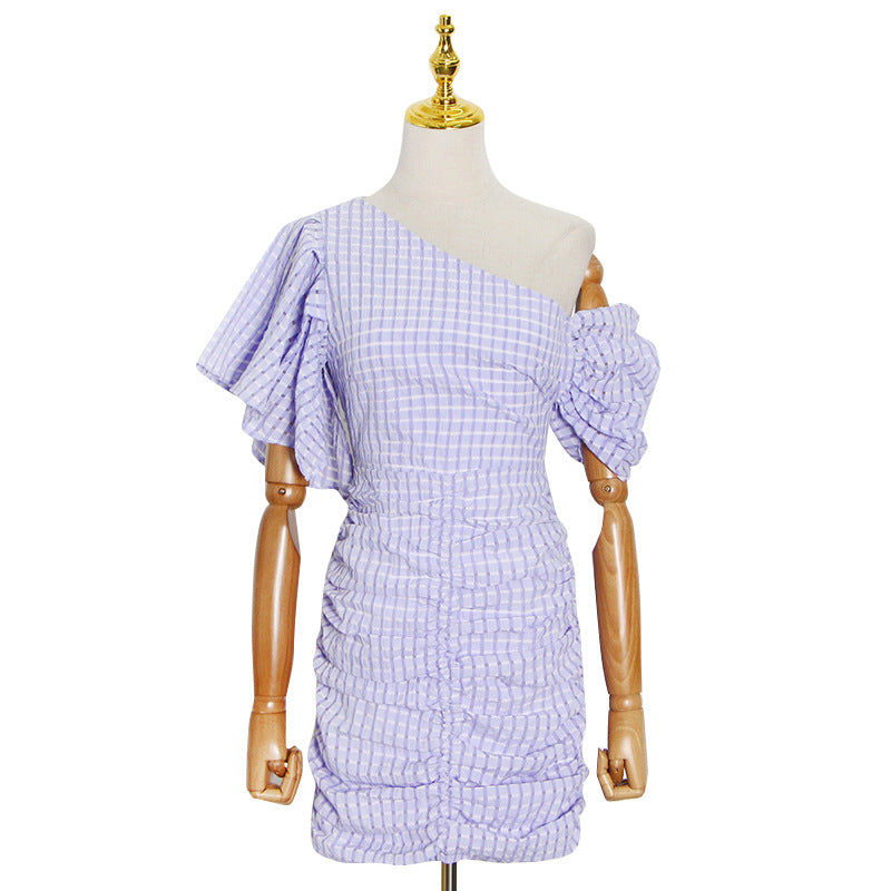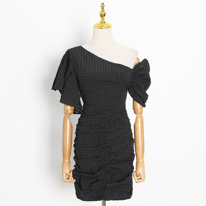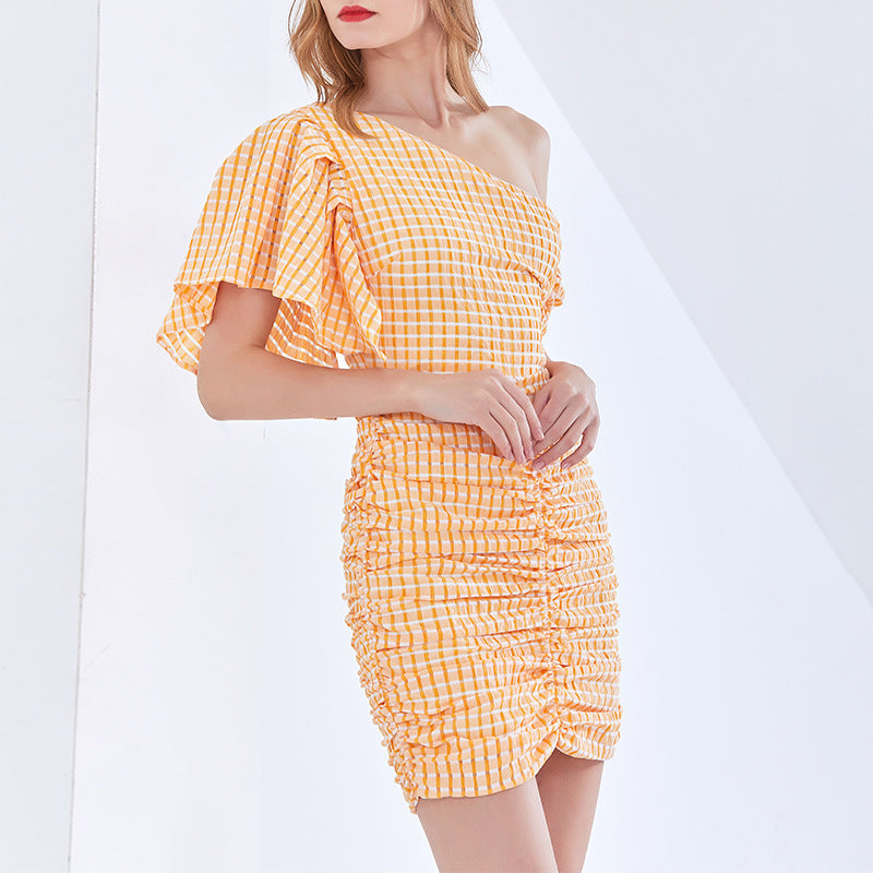 Spring New Fashion Plaid Fold Oblique Shoulder Slim Pencil Bag Hip Skirt Elastic Dress Women