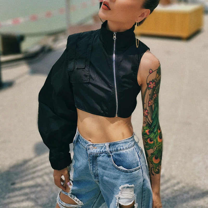 Spring New Fashion Temperament Stand Collar Sexy Off-The-Shoulder Single Sleeve Short Zipper Coat