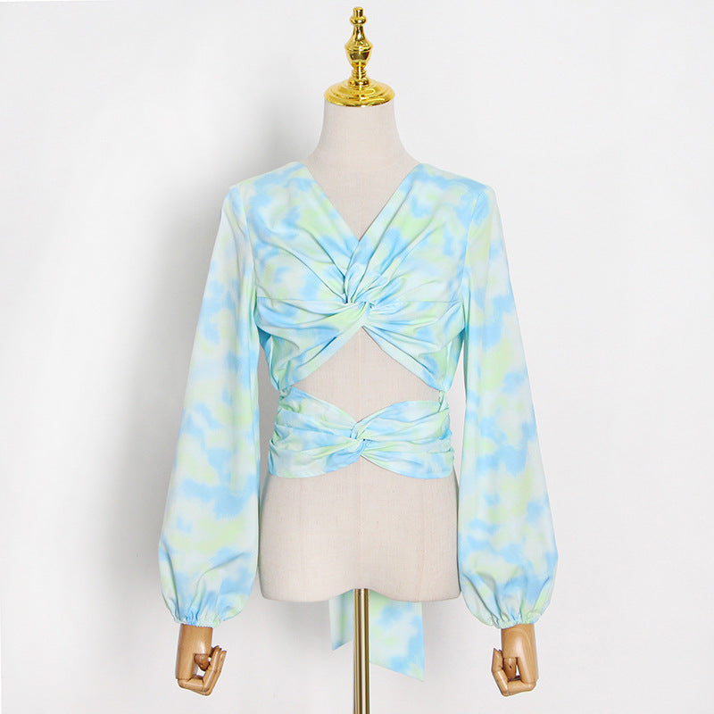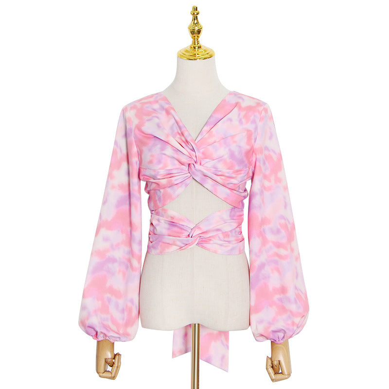 Spring New Style Fashion Temperament Kink Crop Long Sleeve Shirt Printed Lace-Up Short Shirt Woman