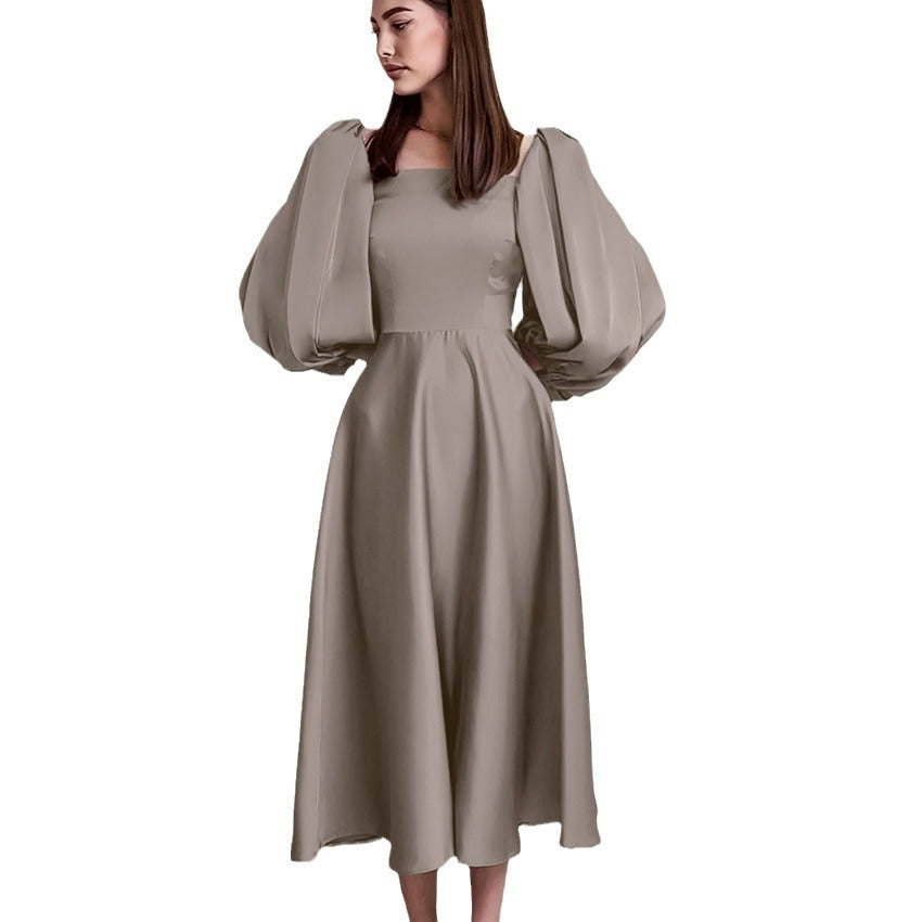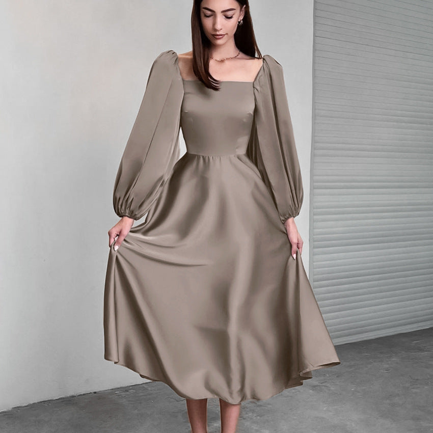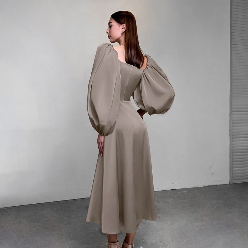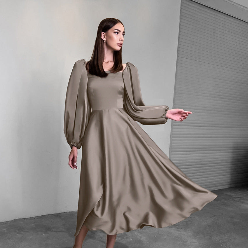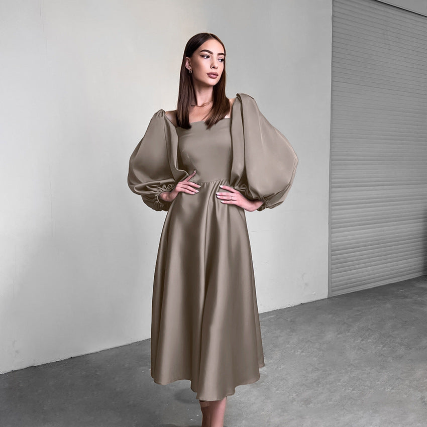 Spring Sexy Temperament Sense Party Evening Dress Fashion Color Satin Satin Square Neck Puffy Sleeve Dress