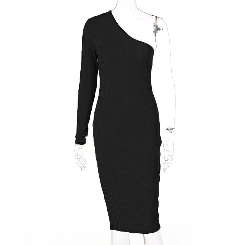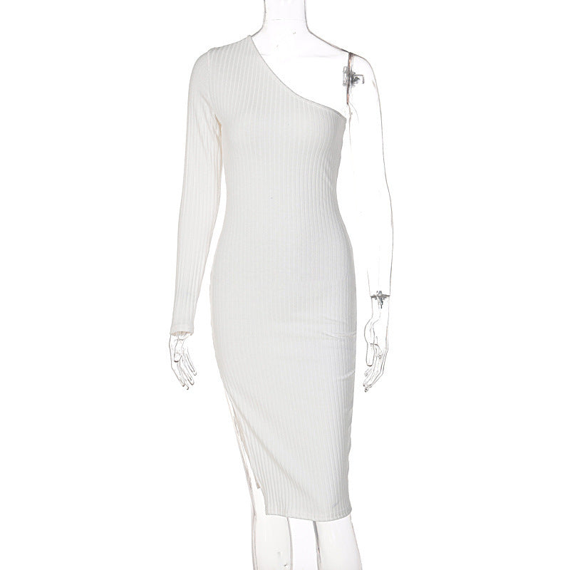 Spring Sweater New Women's Fashion Solid Color Knitted Oblique Shoulder Split Dress