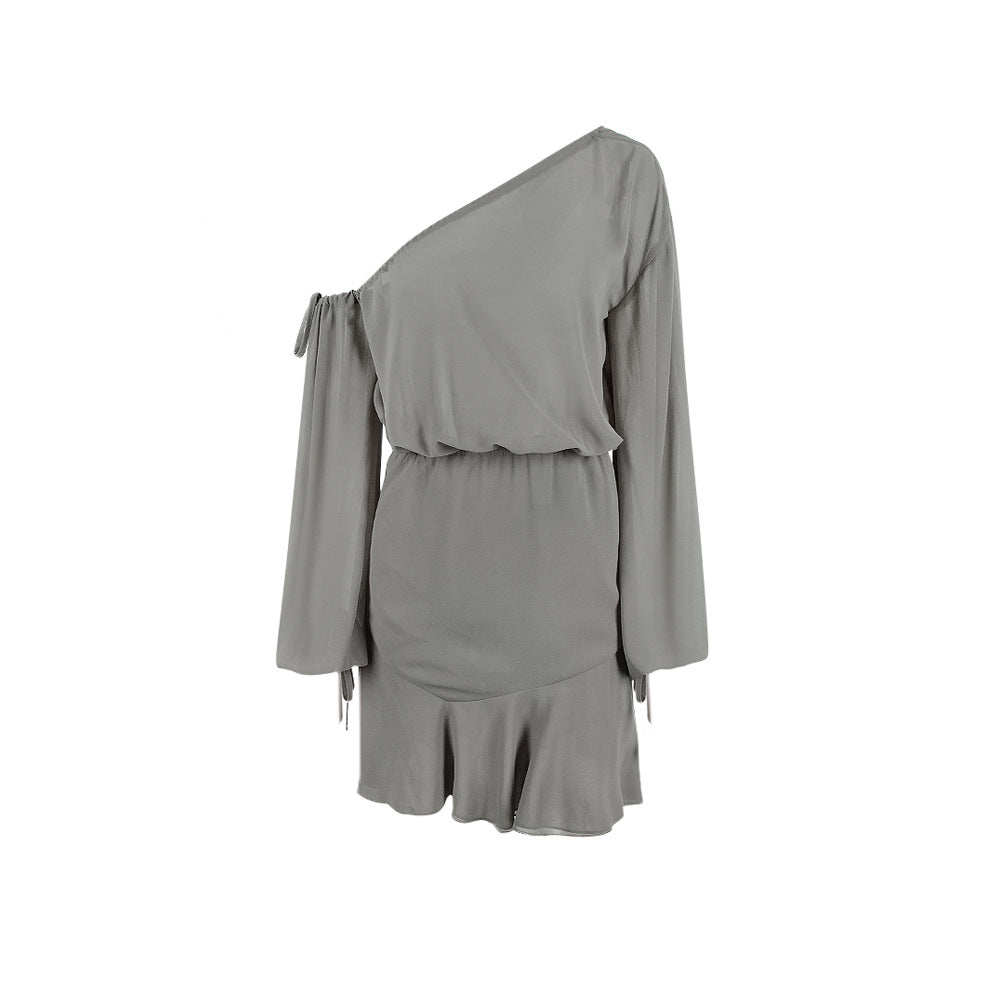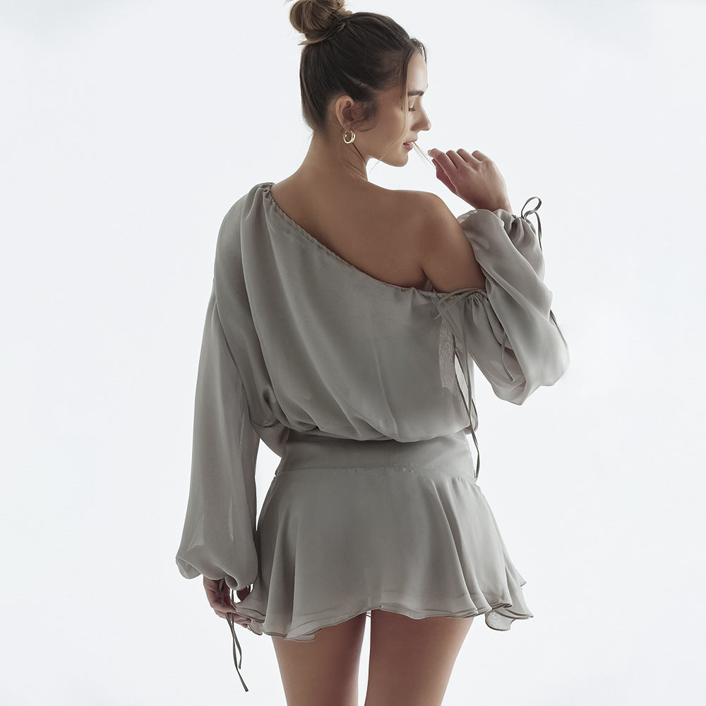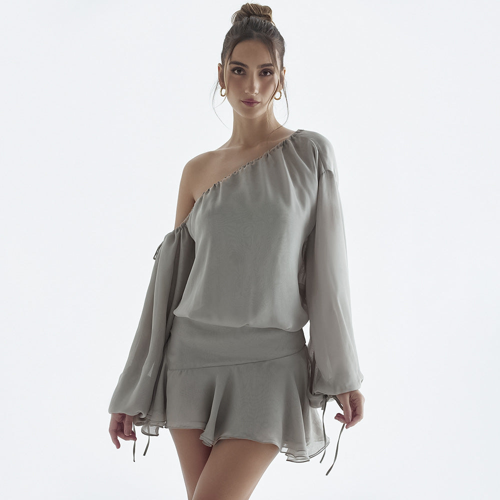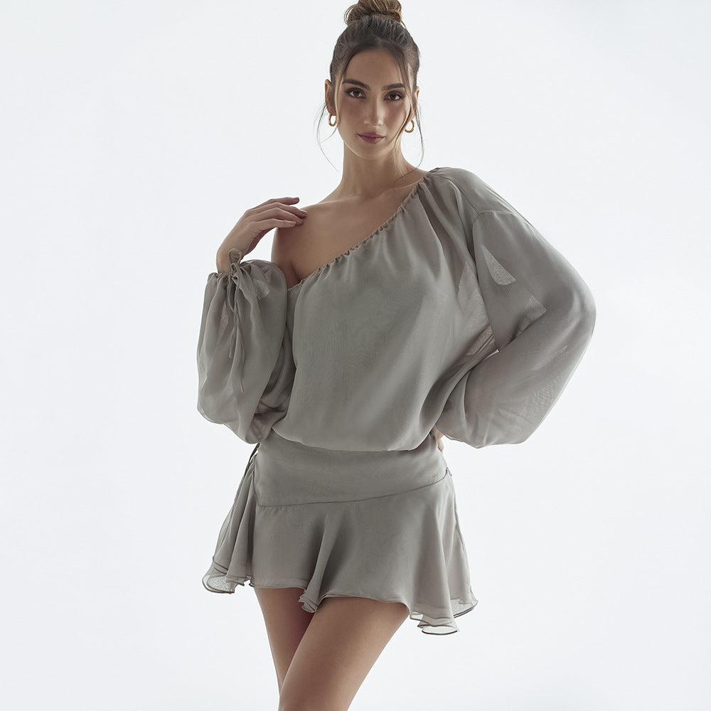 Spring Women's Fashion Diagonal Shoulder Long Sleeve Chiffon Spring Dress Short Commuter Women's Short Skirt