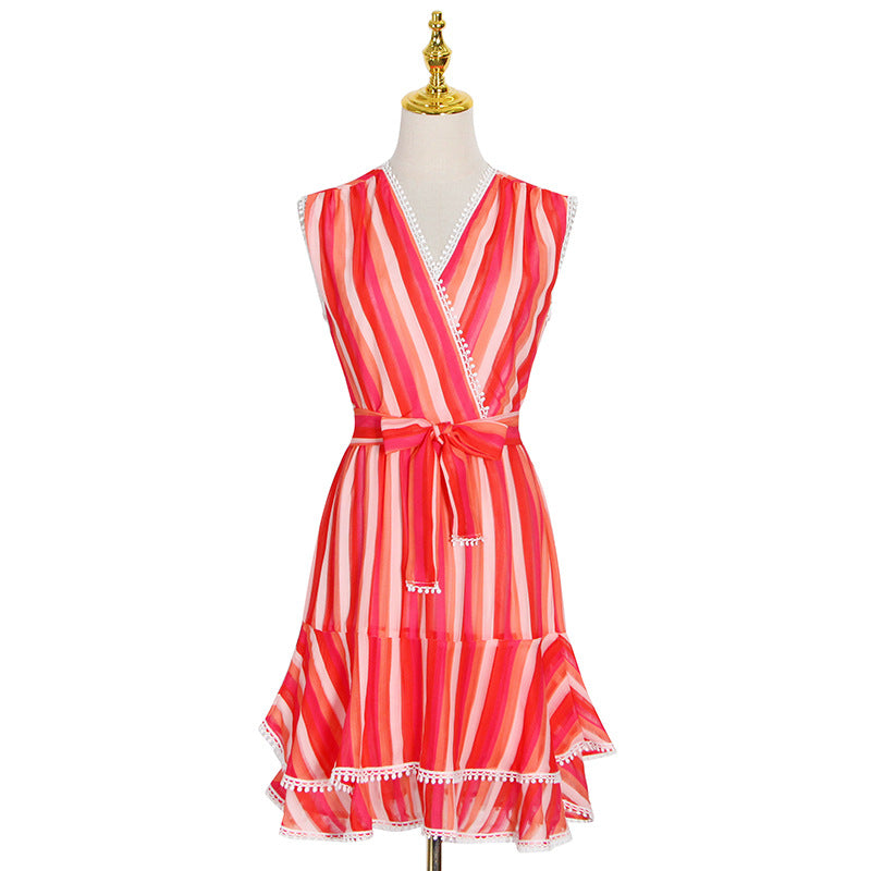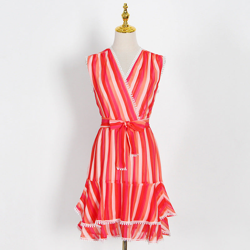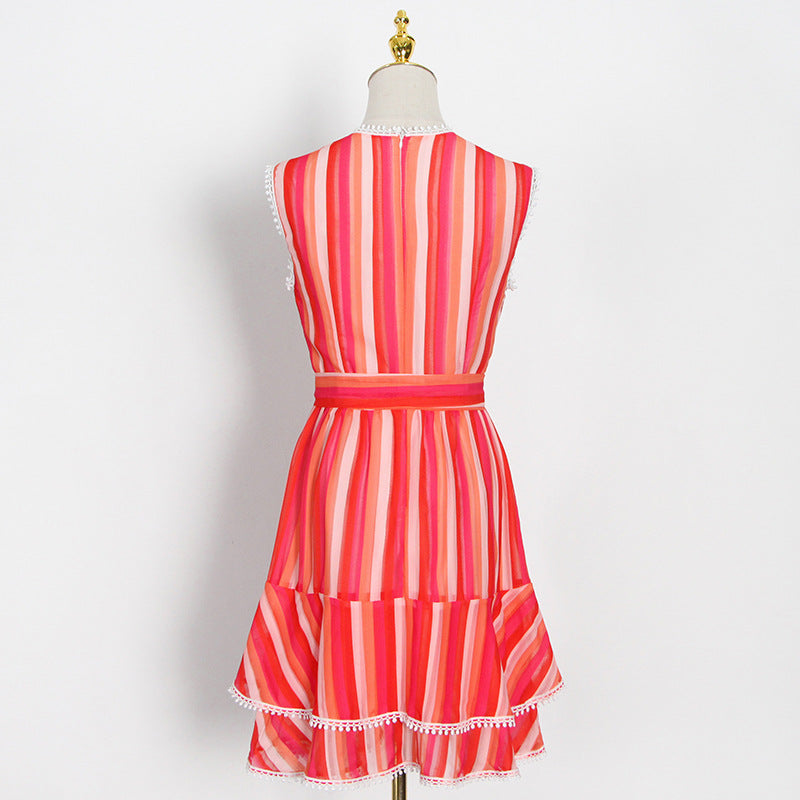 Stripes Contrast Color A-Line Skirt Spring New Fashion V-Neck Sleeveless Chiffon Ruffled Dress Women