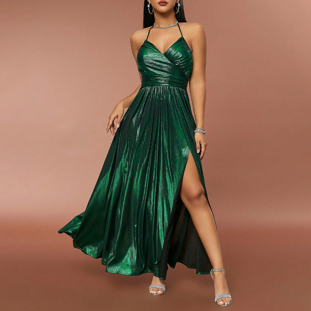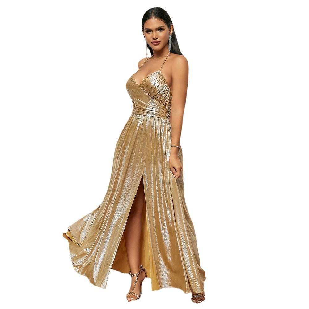 Summer New Sexy Spice Dress Retro Pleated Slit Big Halter Dress