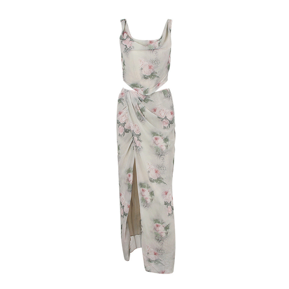 Summer Women's Chiffon Print Spice Girls Halter Crop Top Skirt Split Long Skirt Two-Piece Set