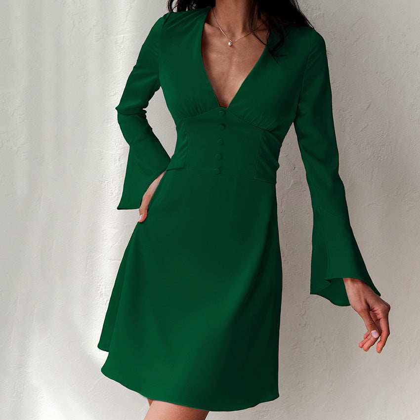 Temperament Imitation Acetate Tint V-Neck Flared Sleeve Dress Spring New Fashion Woman