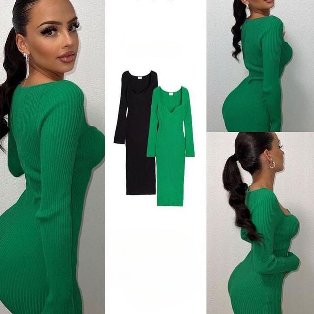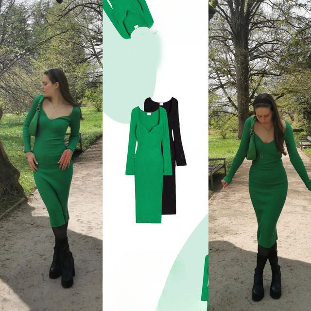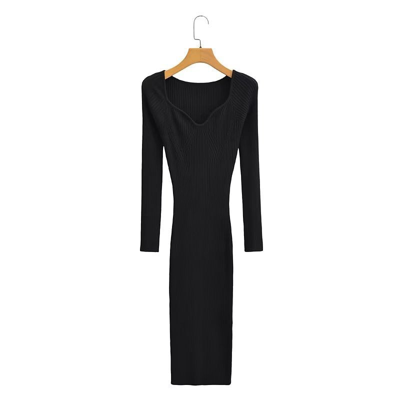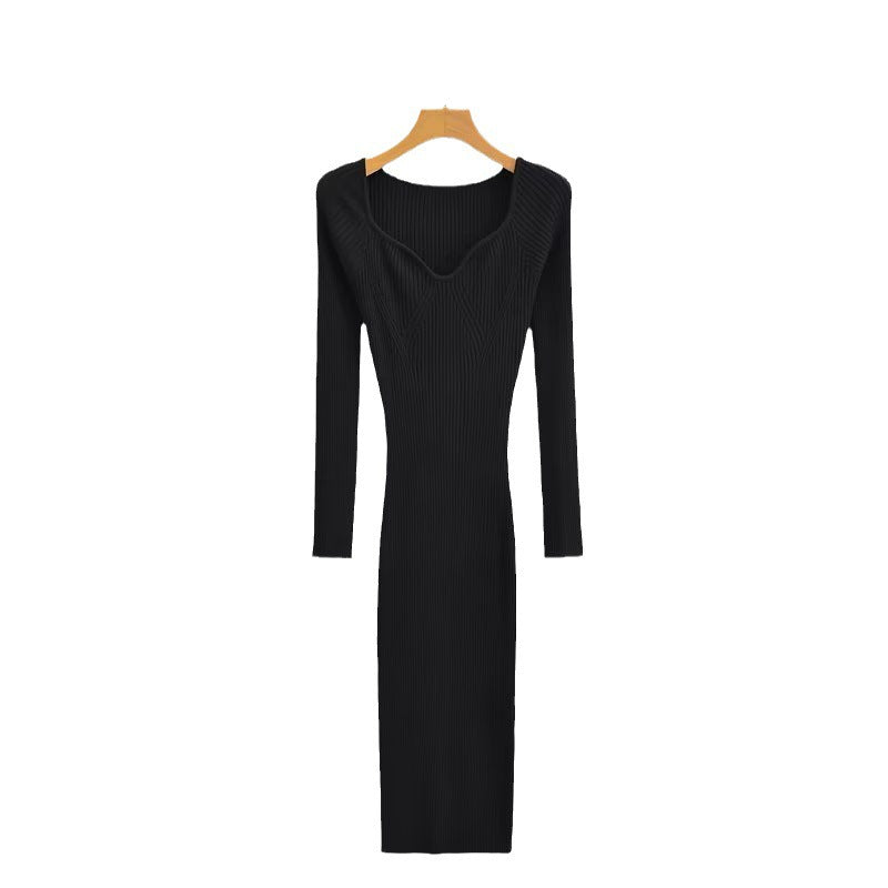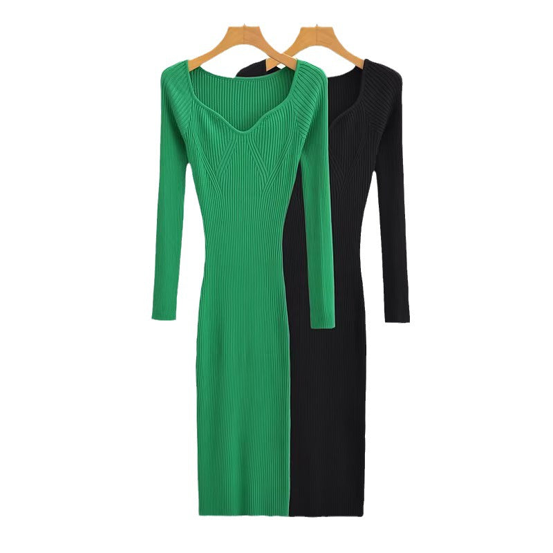New V-Neck Slim-Fit Knit Dress For Women In Autumn And Winter With A Mid-Length Long-Sleeved Tight Bottom Wrap Hip Skirt