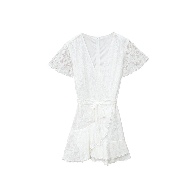 Thin Belt Waist Slimming Dress Female Slim Short Sleeve Deep V Lace Knee-Length Skirt