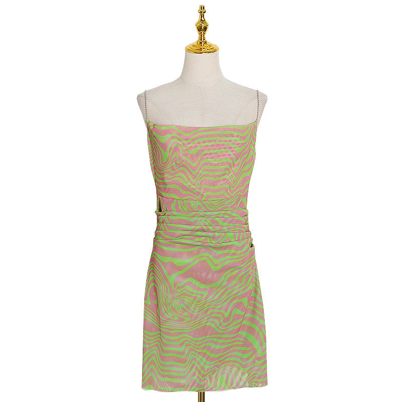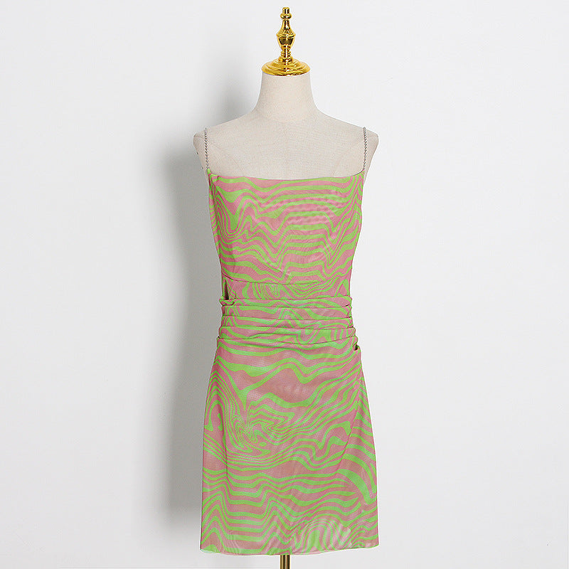 Thin Metal Chain Shoulder Strap Pleated Print Elastic Slim Short Dress Woman