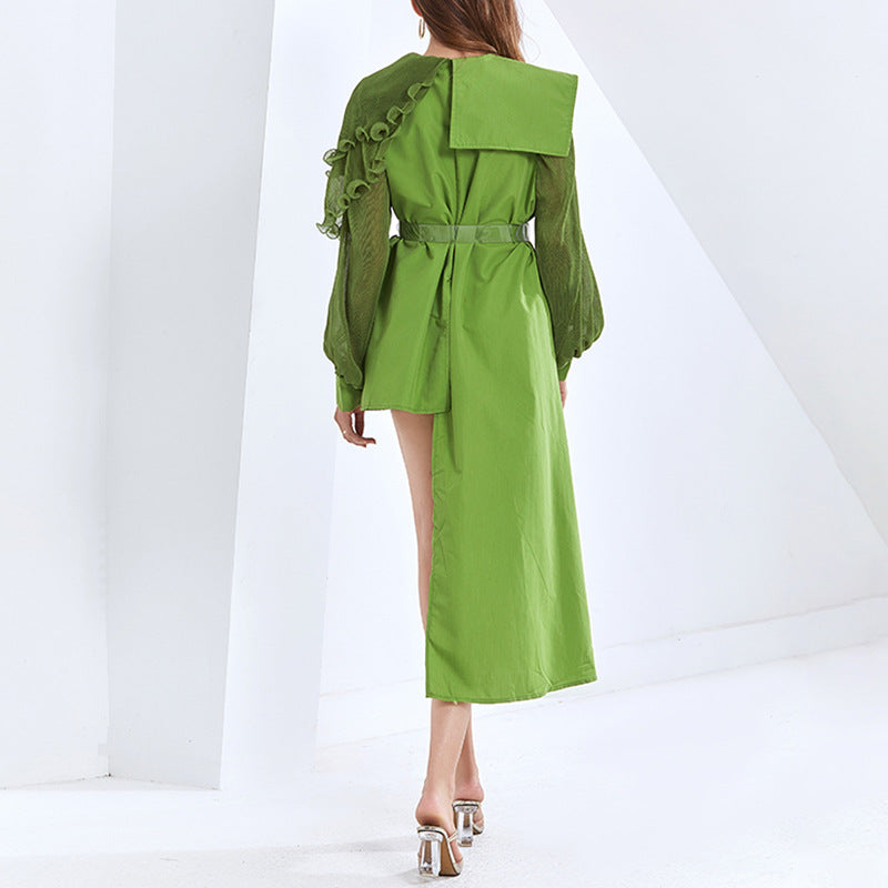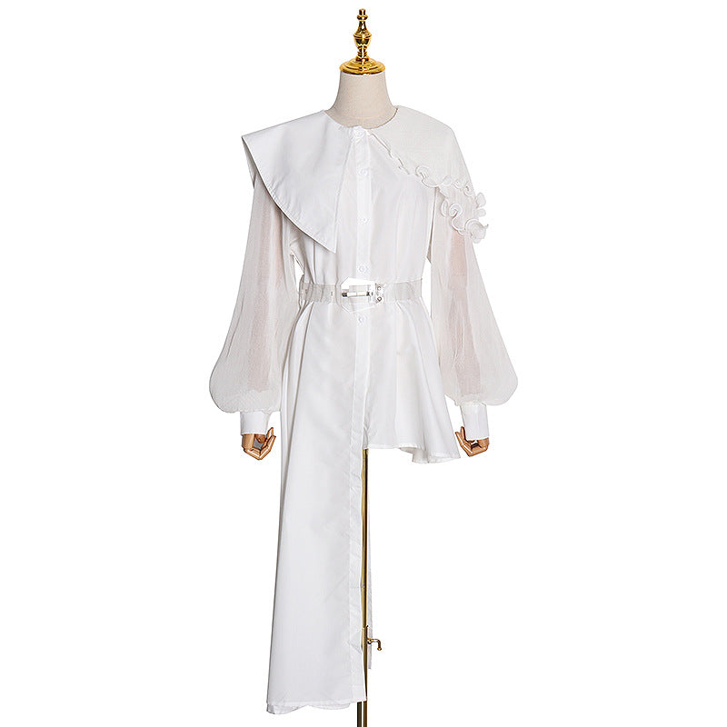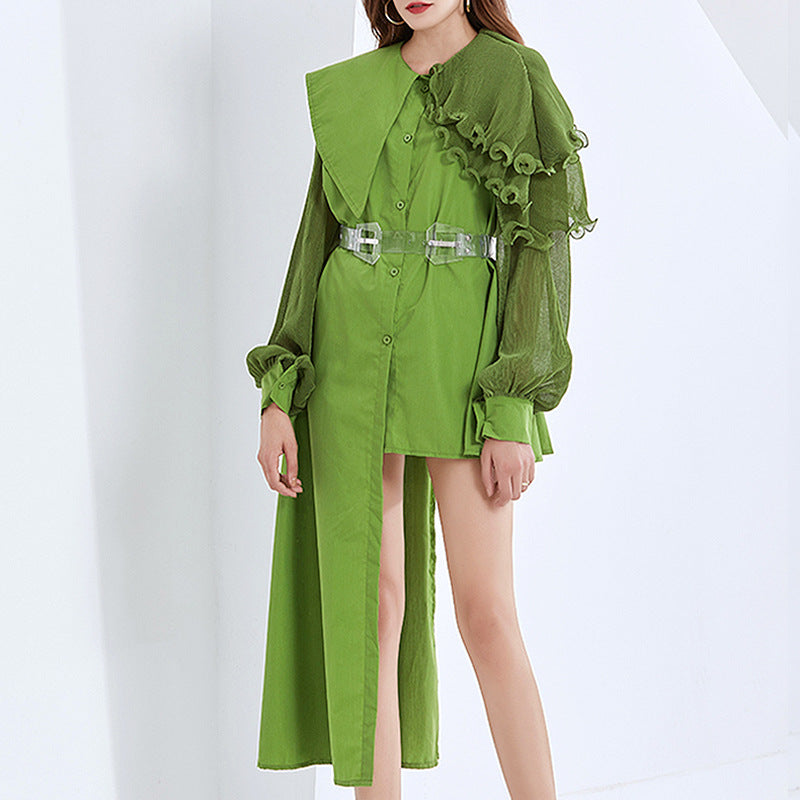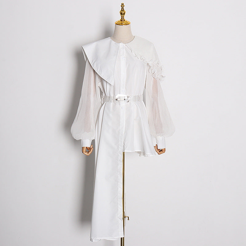 Ultra Heavy Ruffled Irregular Splicing Top Spring New Pleated Long-Sleeved Shirt With Belt Women's Fashion