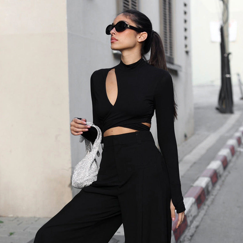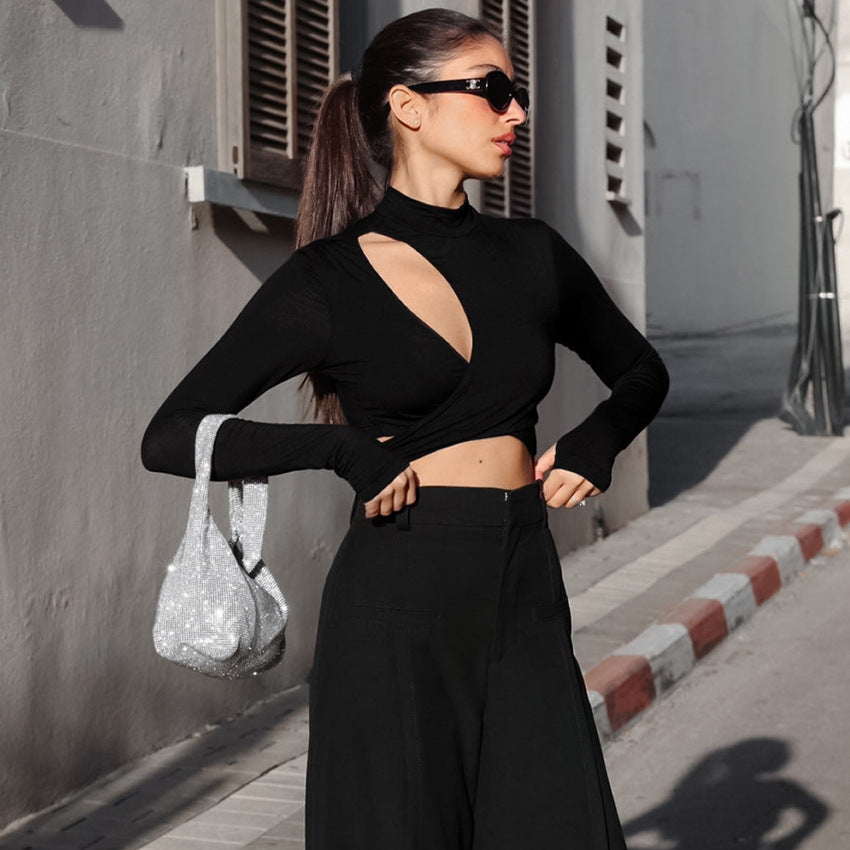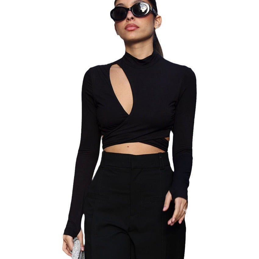White Cotton Knitted Irregular Hollow Binding Slim T-Shirt New Autumn Fashion Woman