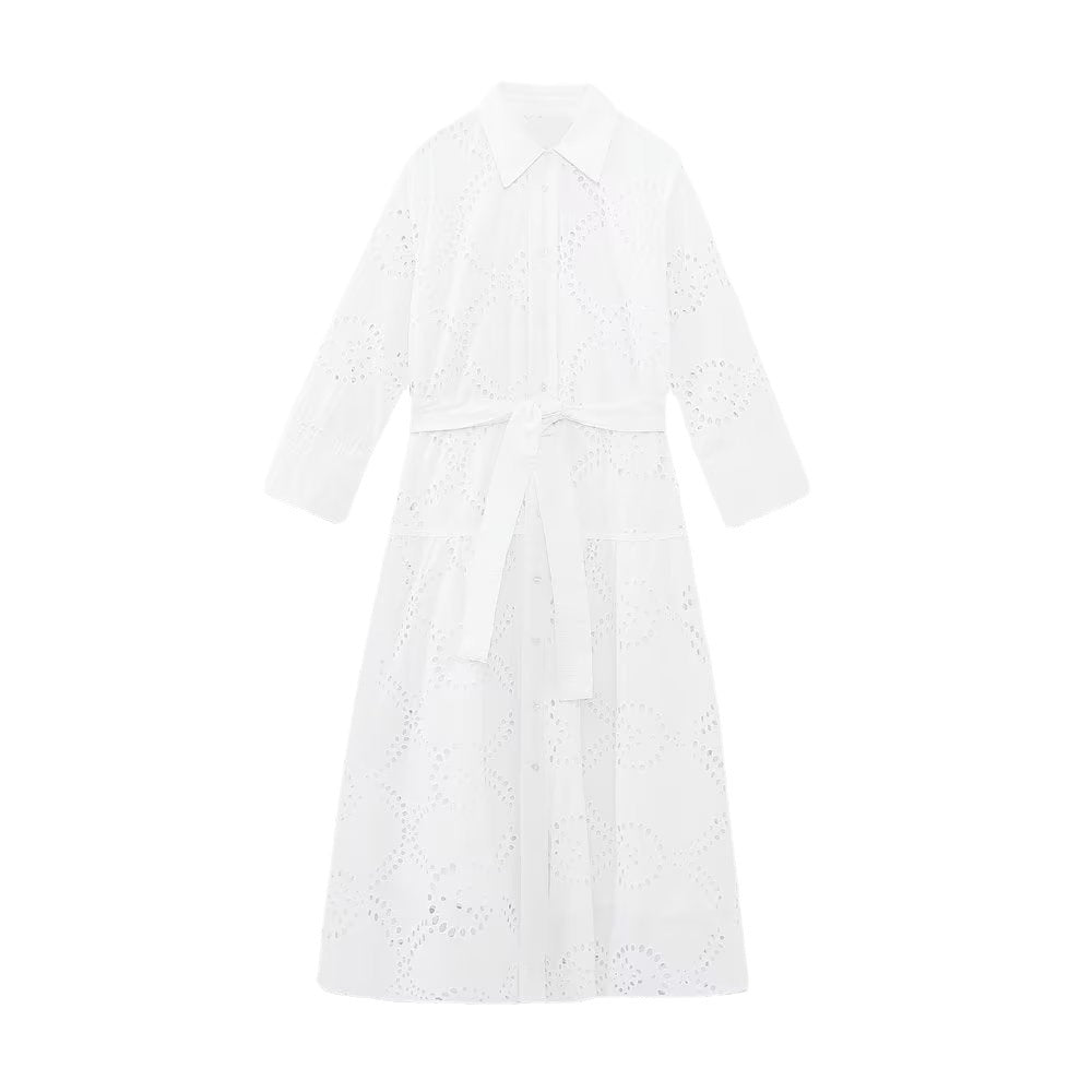 Wind Summer Women's New White Long-Sleeved Embroidered Midi Dress